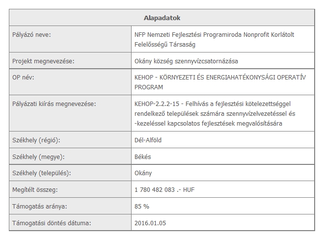 Ezek szerint 1 780 482 083 Ft (1,78 Mrd Ft) vissza nem térítendő alaptámogatást hagyott jóvá Okány Község és a NEFPI által konzorciumban benyújtott pályázatára az Irányító Hatóság.