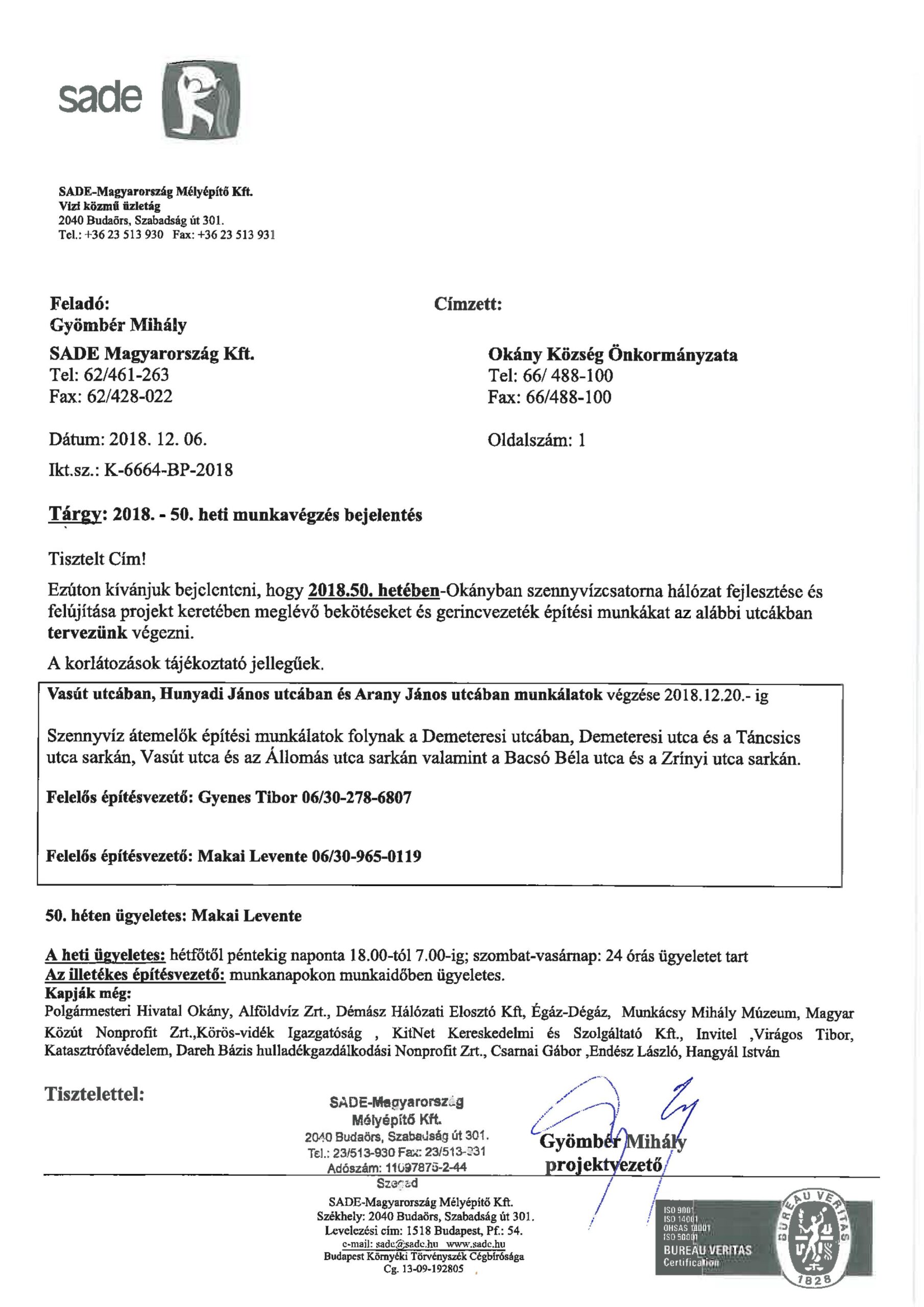 Értesítés munkavégzésről (50.hét)