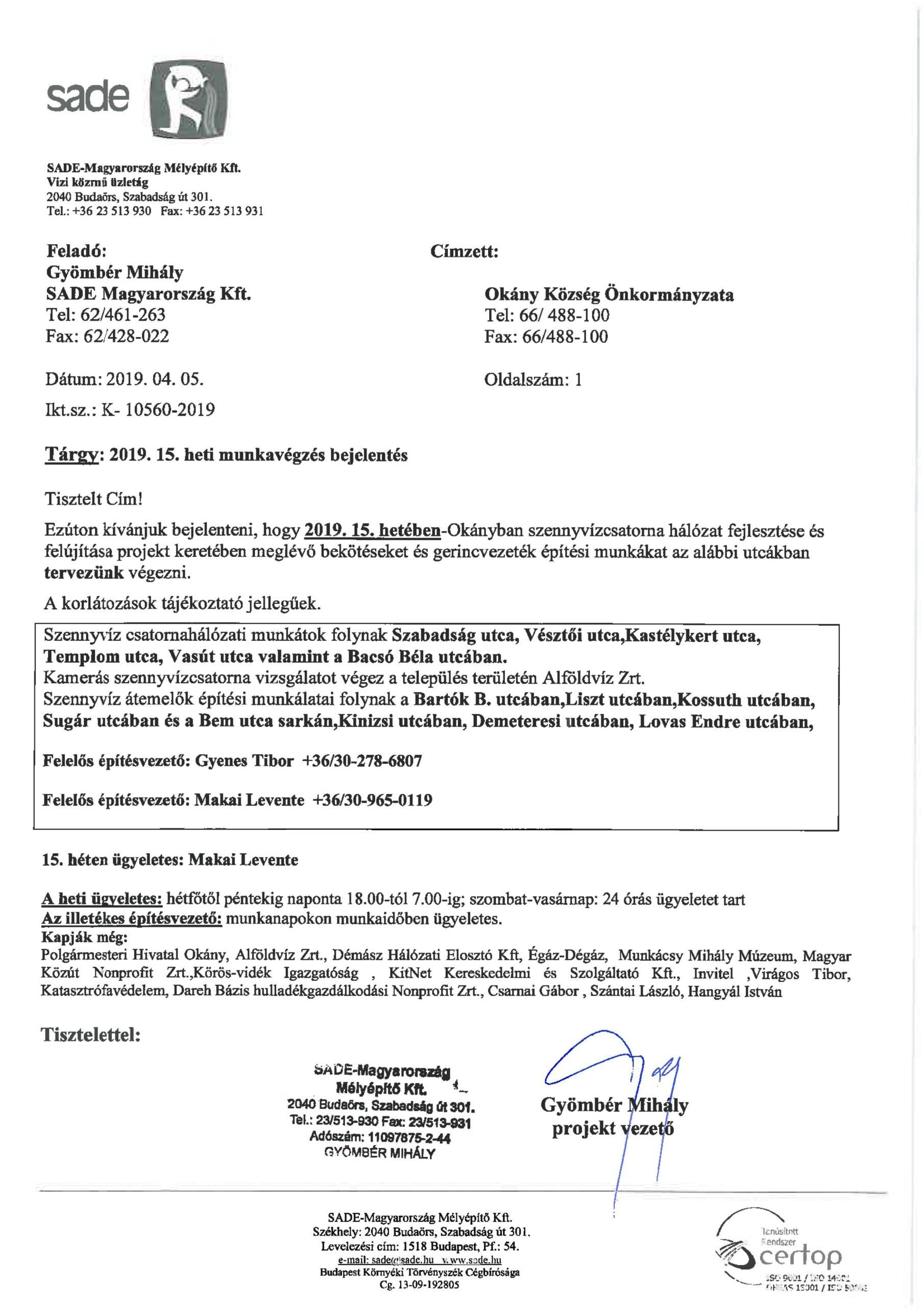 Értesítés munkavégzésről (15.hét)