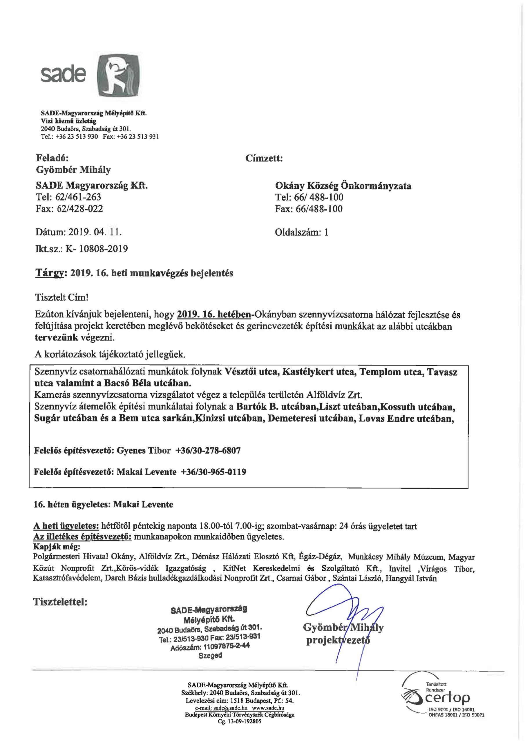 Értesítés munkavégzésről (16.hét)