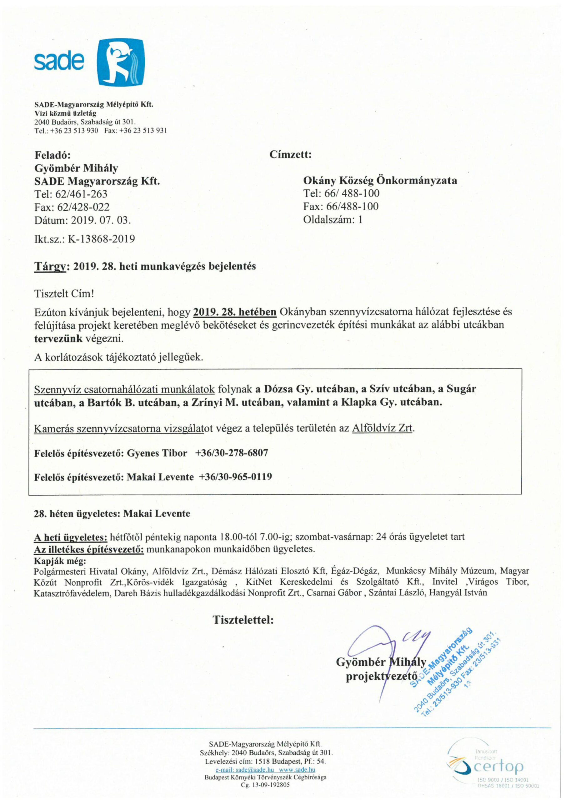 Értesítés munkavégzésről (28.hét)