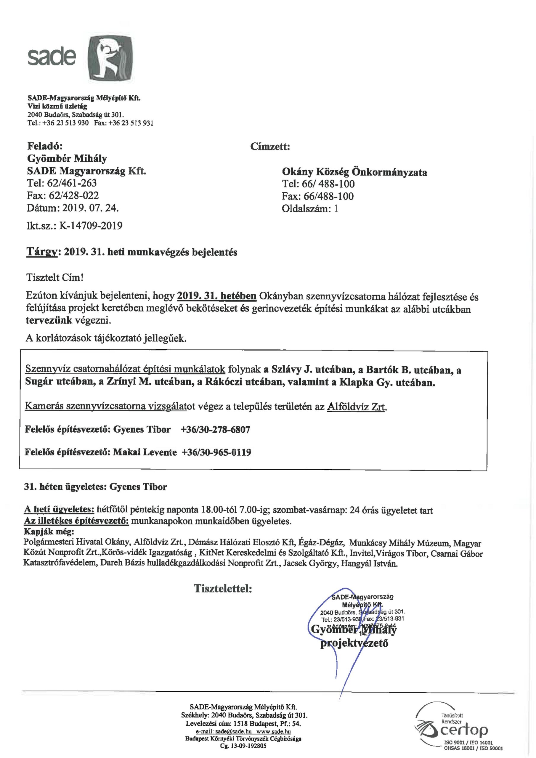 Értesítés munkavégzésről (31.hét)