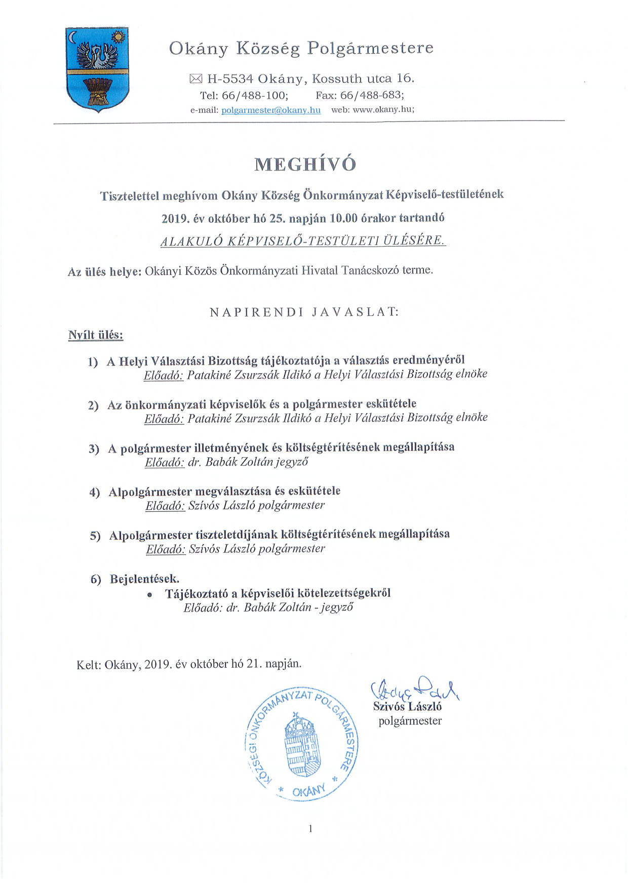 Meghívó 2019. október 25. 10:00: Alakuló Képviselő- testületi ülés