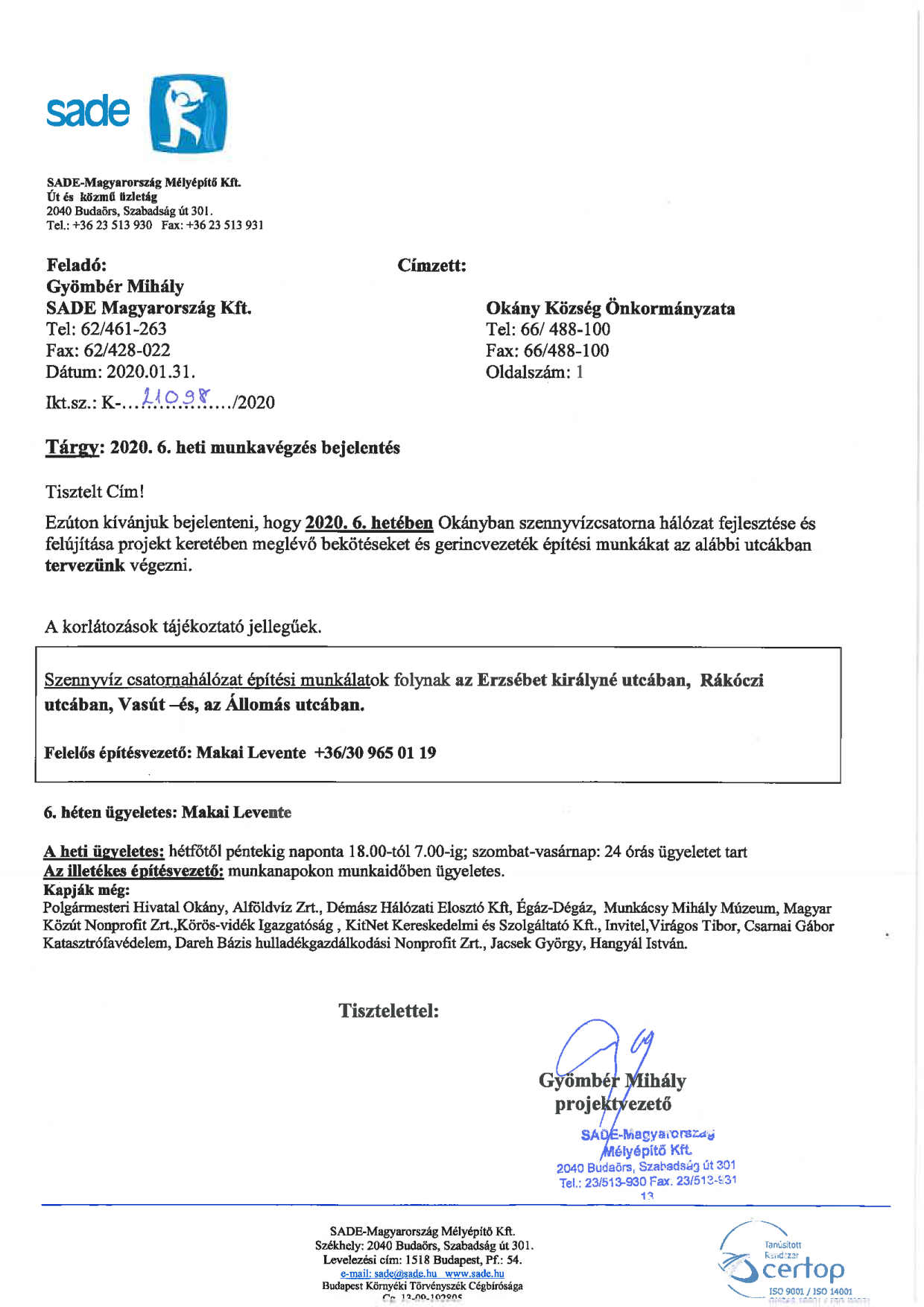 Értesítés munkavégzésről (2020. 6.hét)