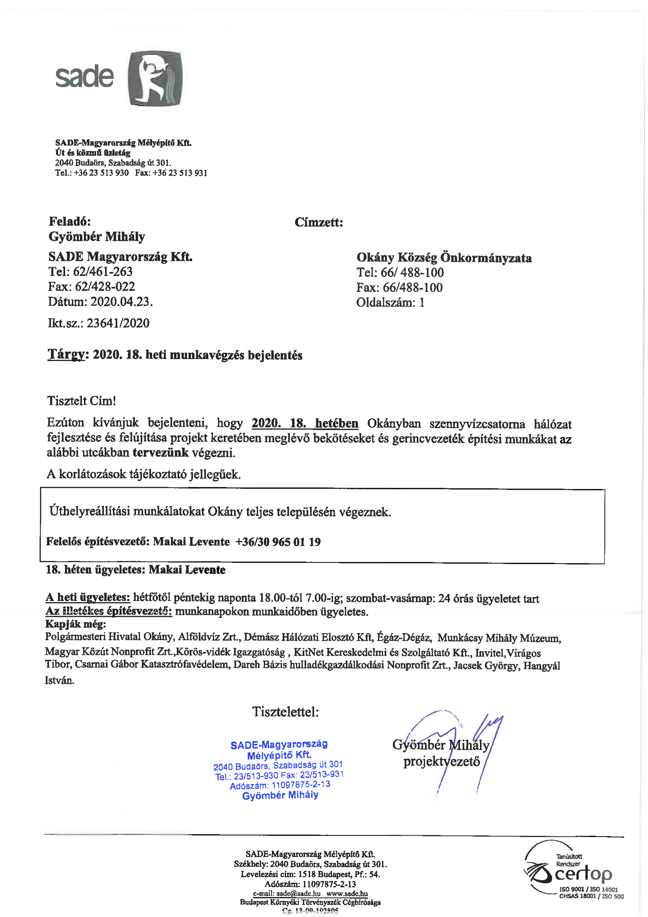 Értesítés munkavégzésről (2020. 18. hét)