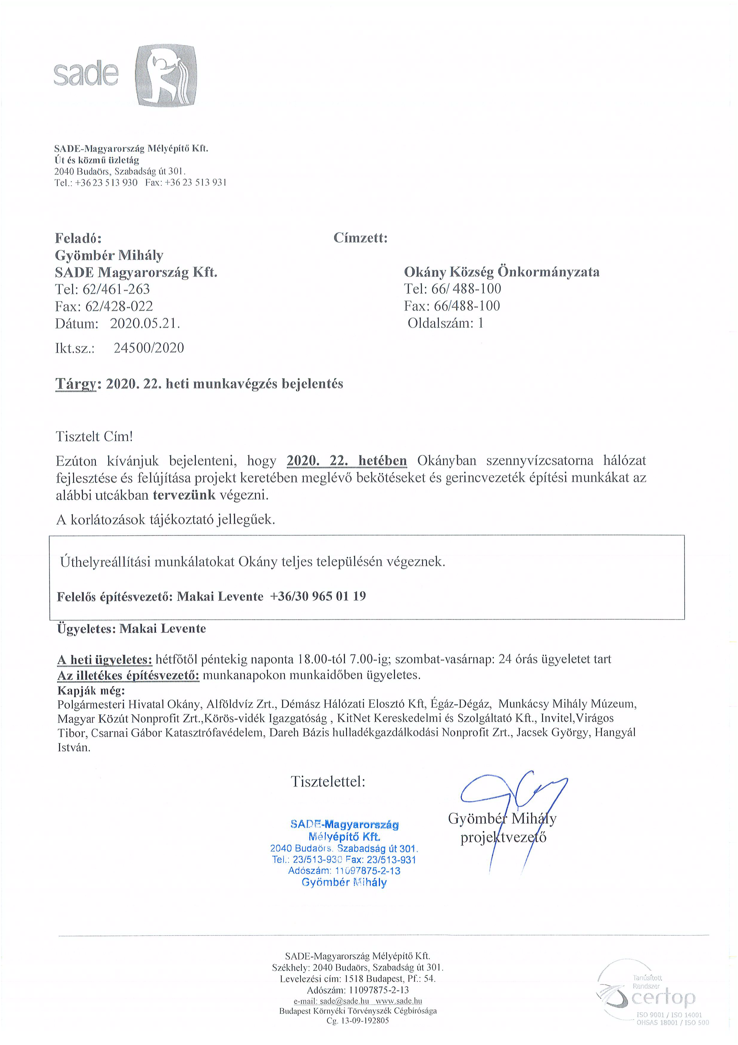 Értesítés munkavégzésről (2020. 22. hét)