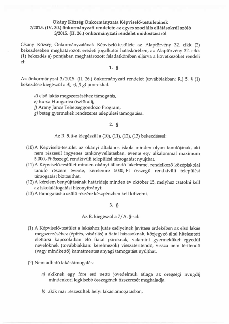 -Okány Község Képviselő-testülete az okányi általános iskola minden olyan tanulójának, aki nem részesül ingyenes tankönyvellátásban, 5.000.-Ft összegű rendkívüli települési támogatást (beiskolázási támogatást) nyújt!