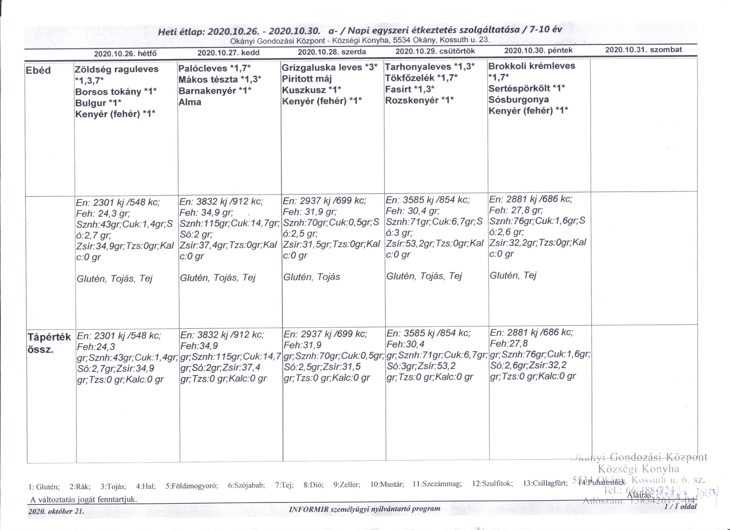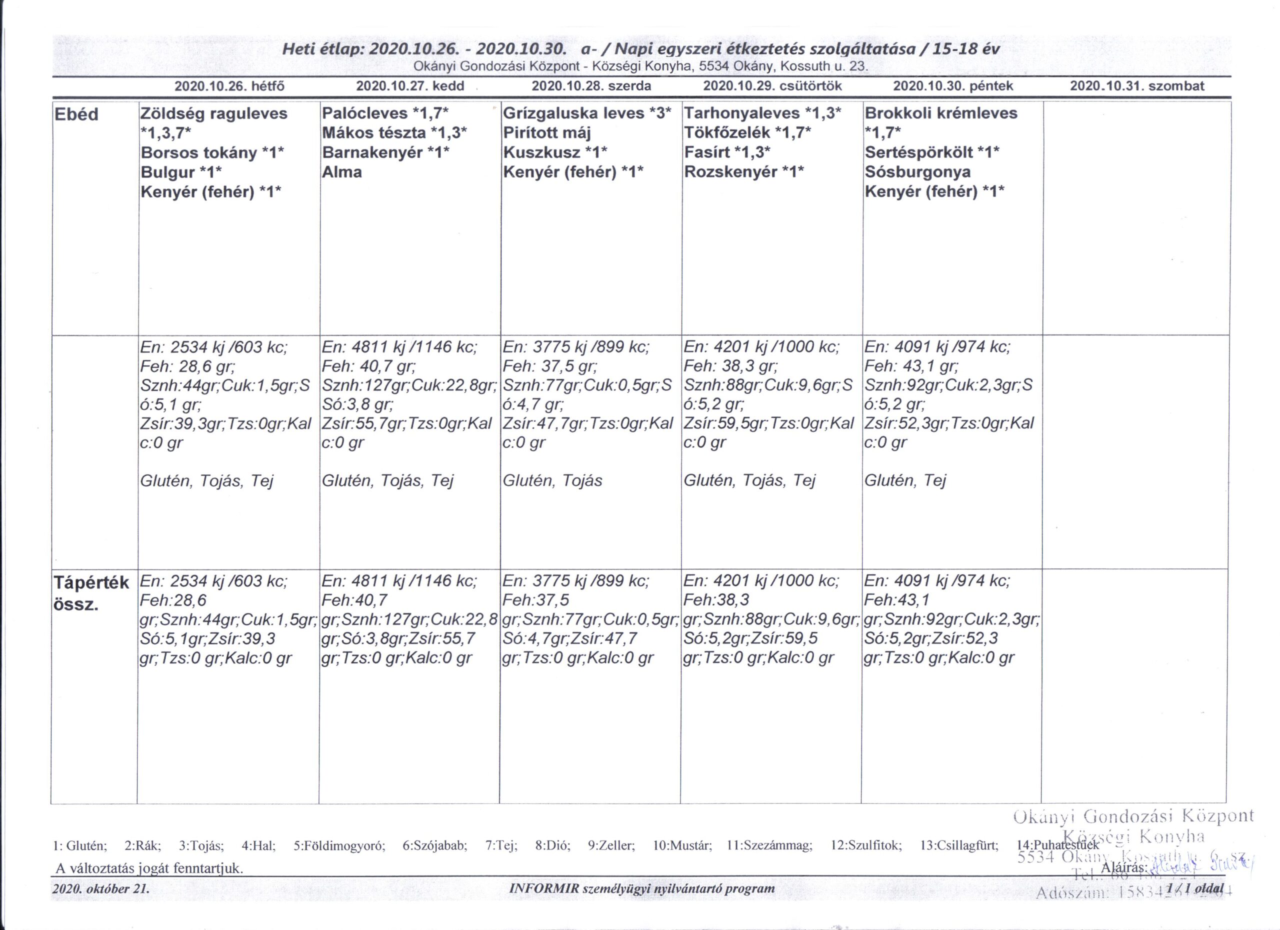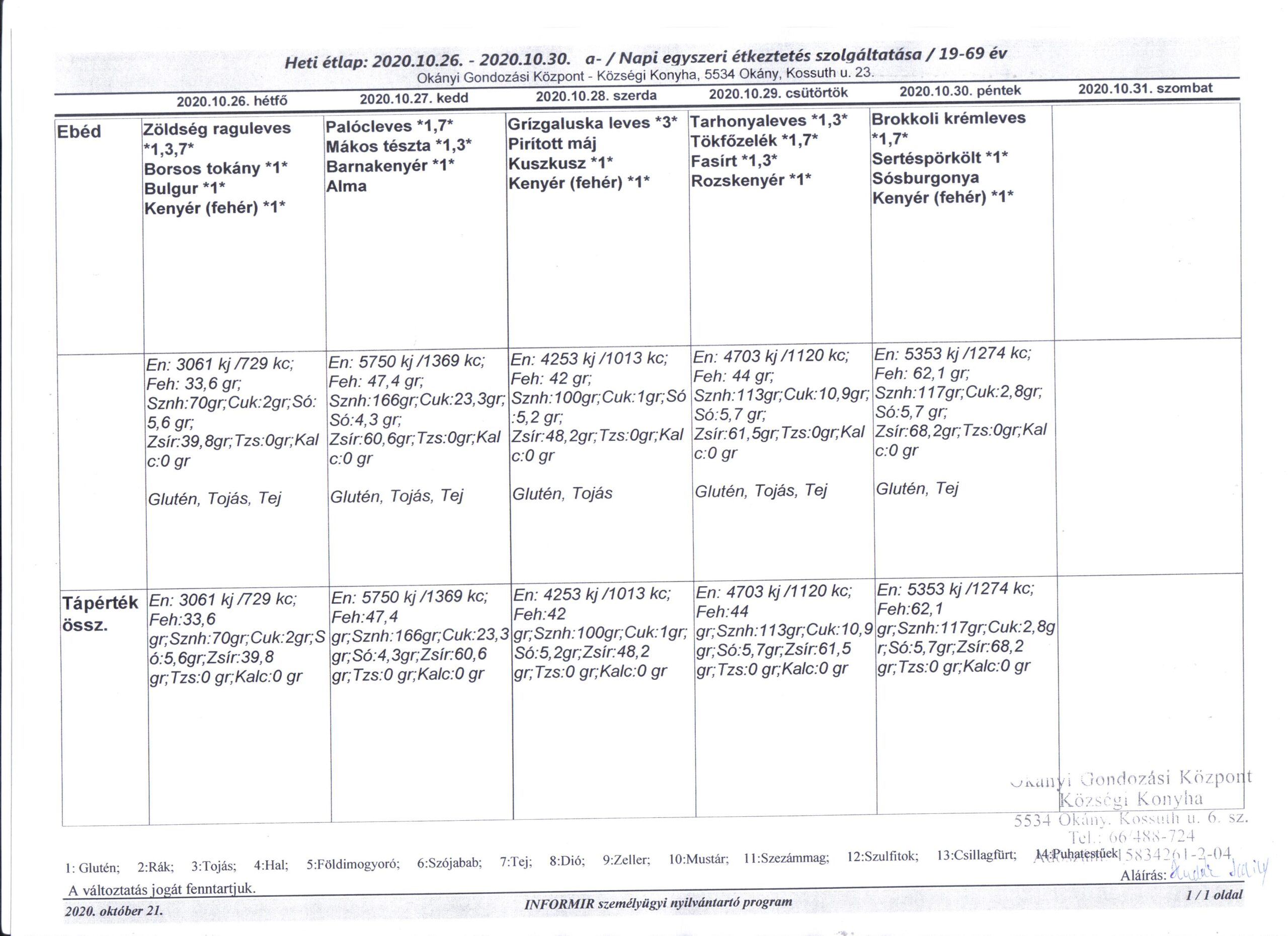 Konyha Étlap korosztályos bontásban 2020.10.26. – 2020.10.30.