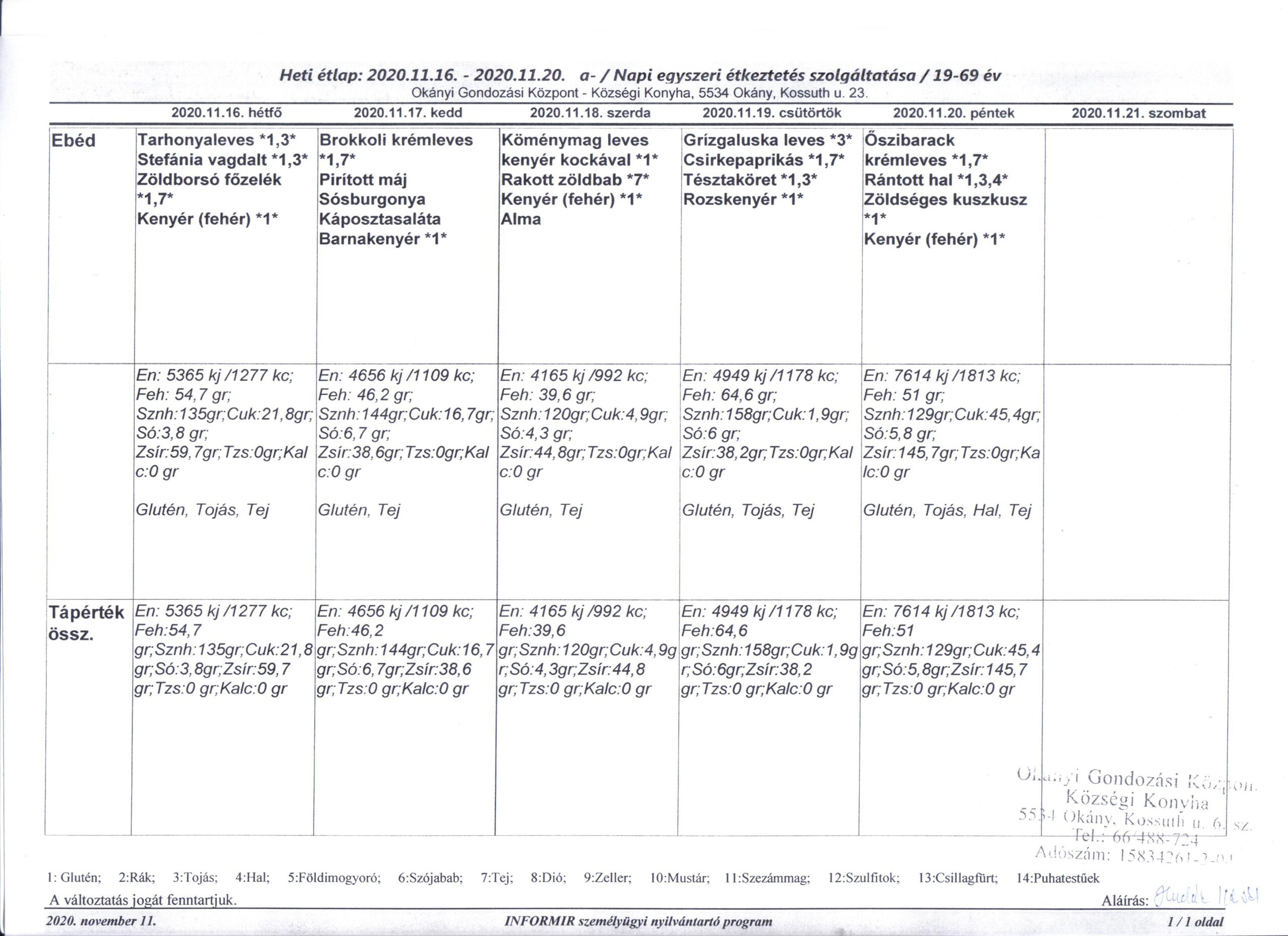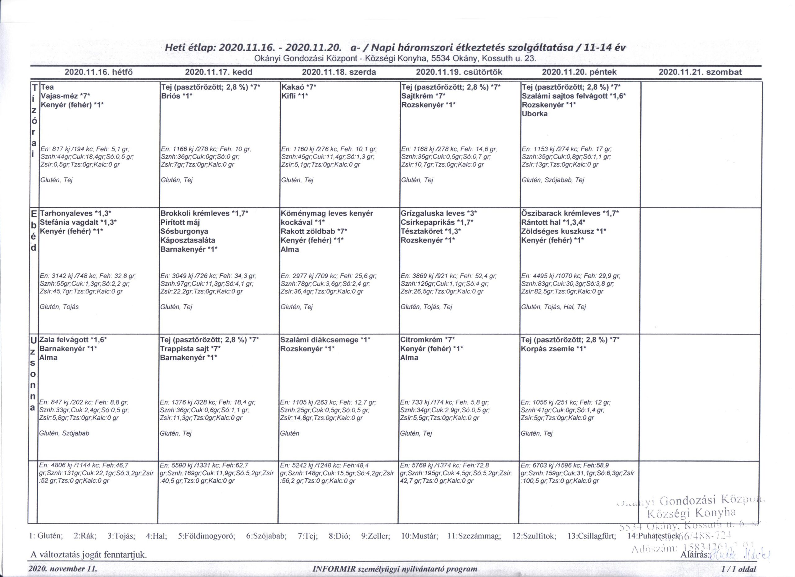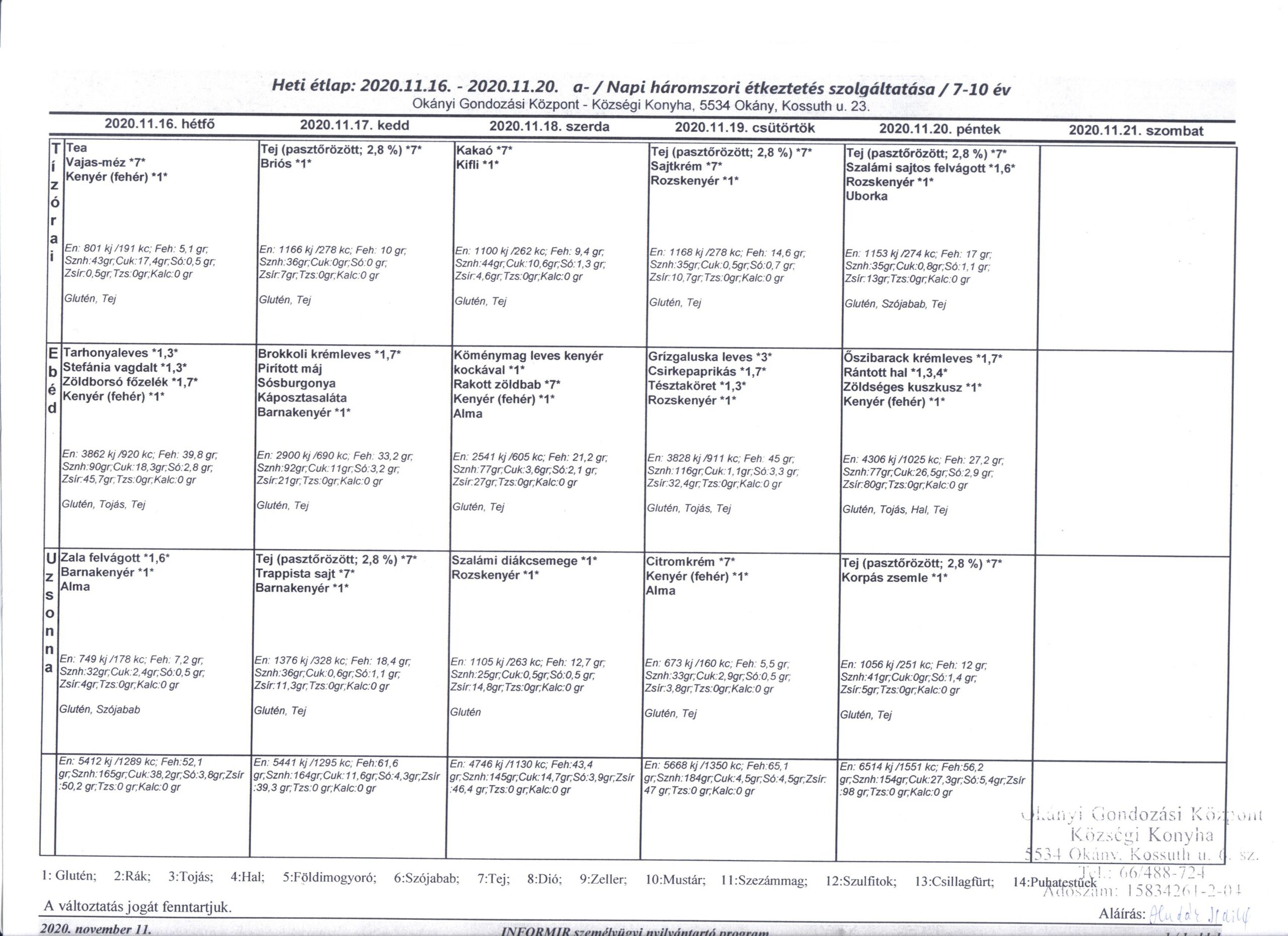 Konyha Étlap korosztályos bontásban 2020.11.16. – 2020.11.20.