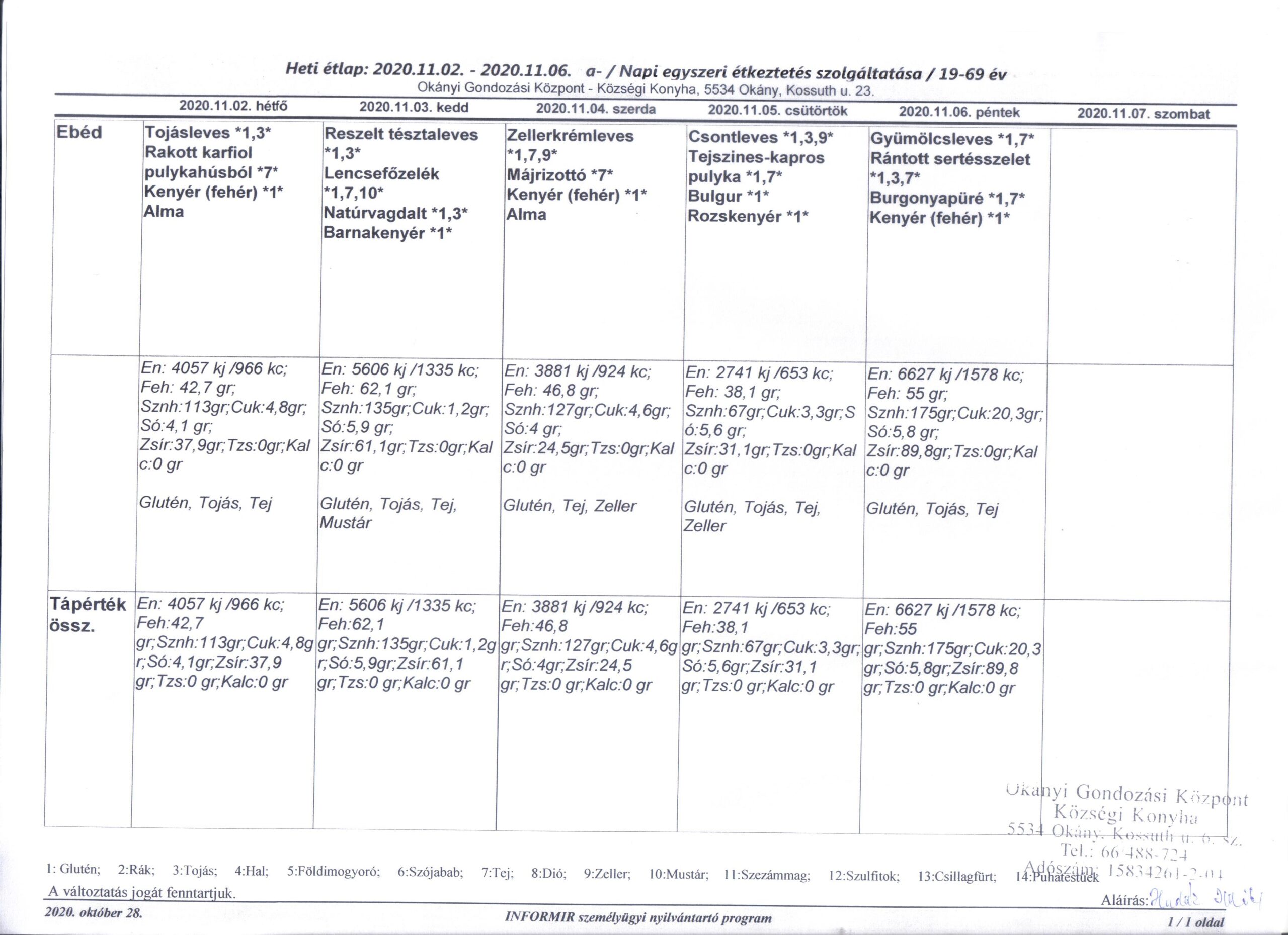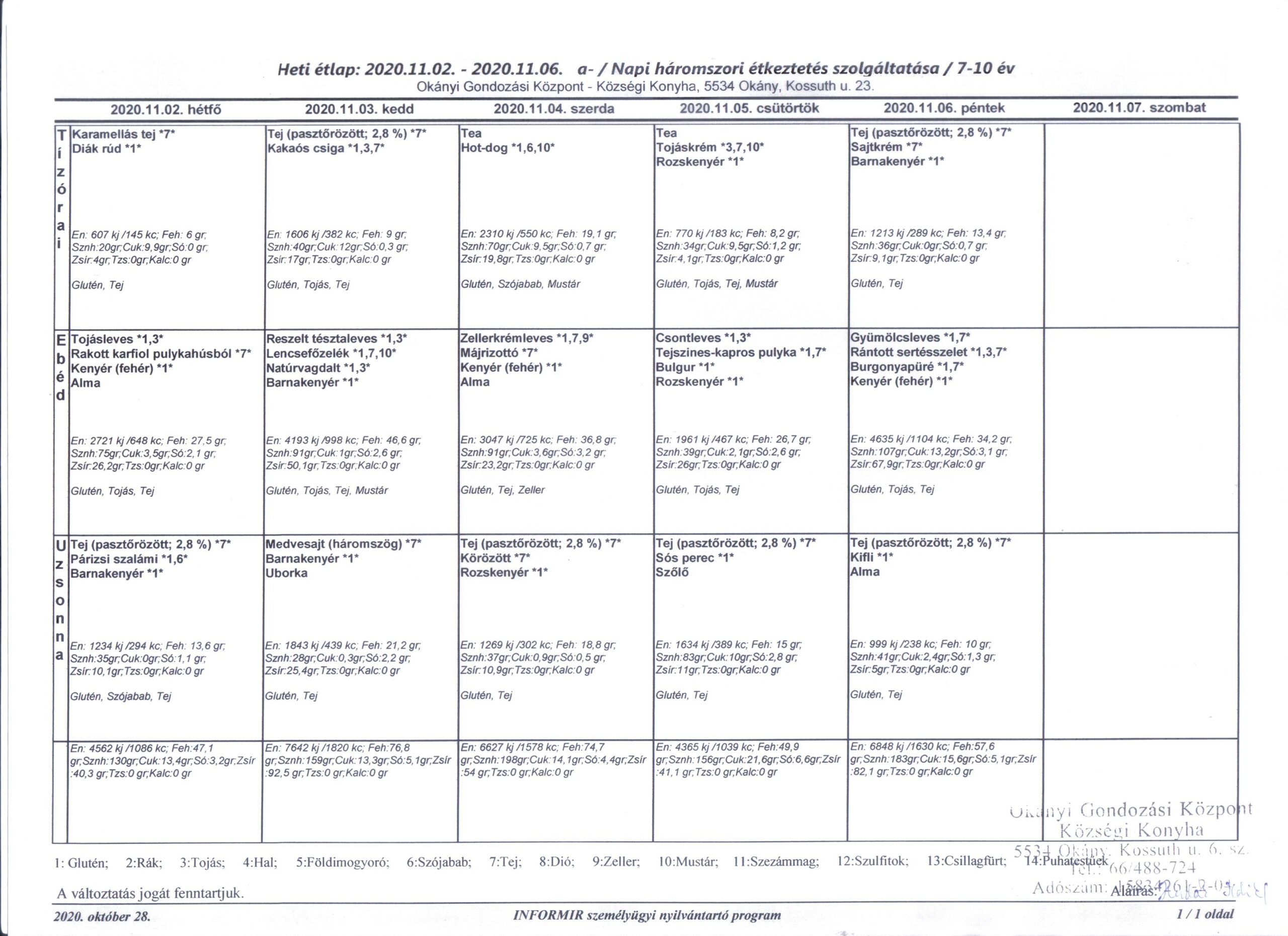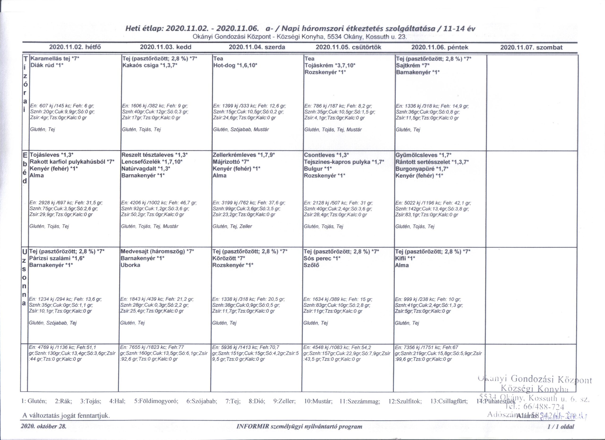 Konyha Étlap korosztályos bontásban 2020.11.02. – 2020.11.06.
