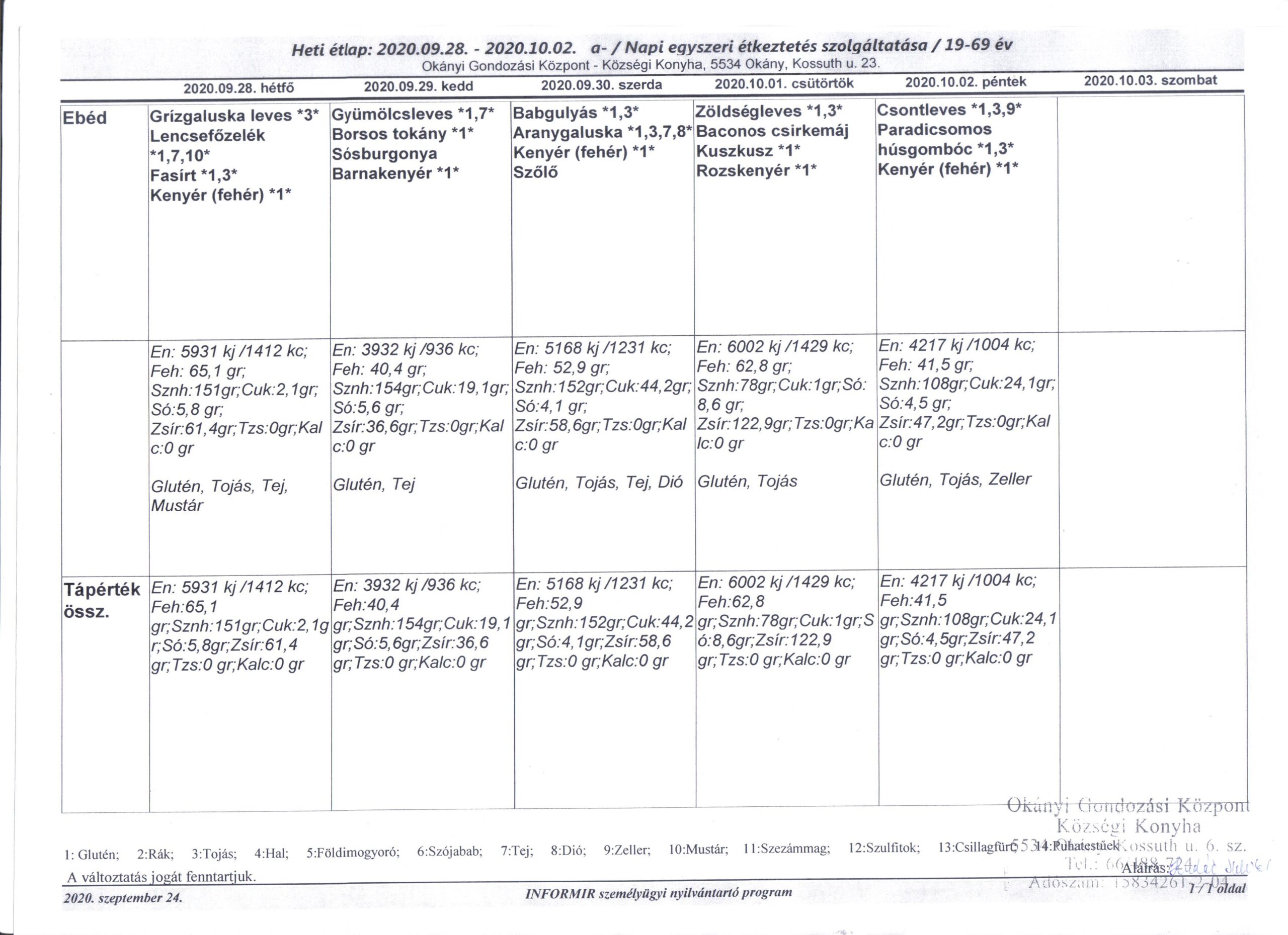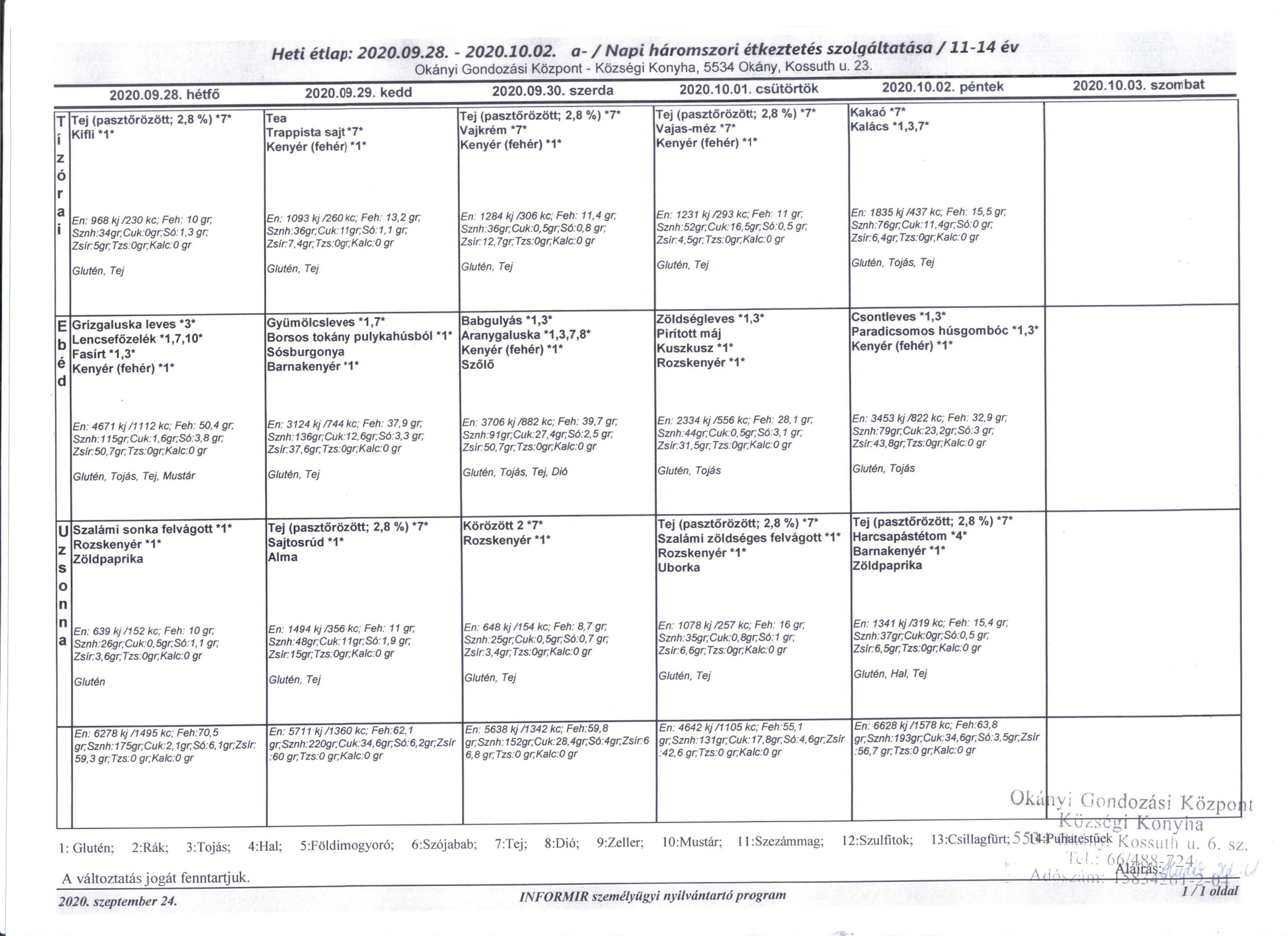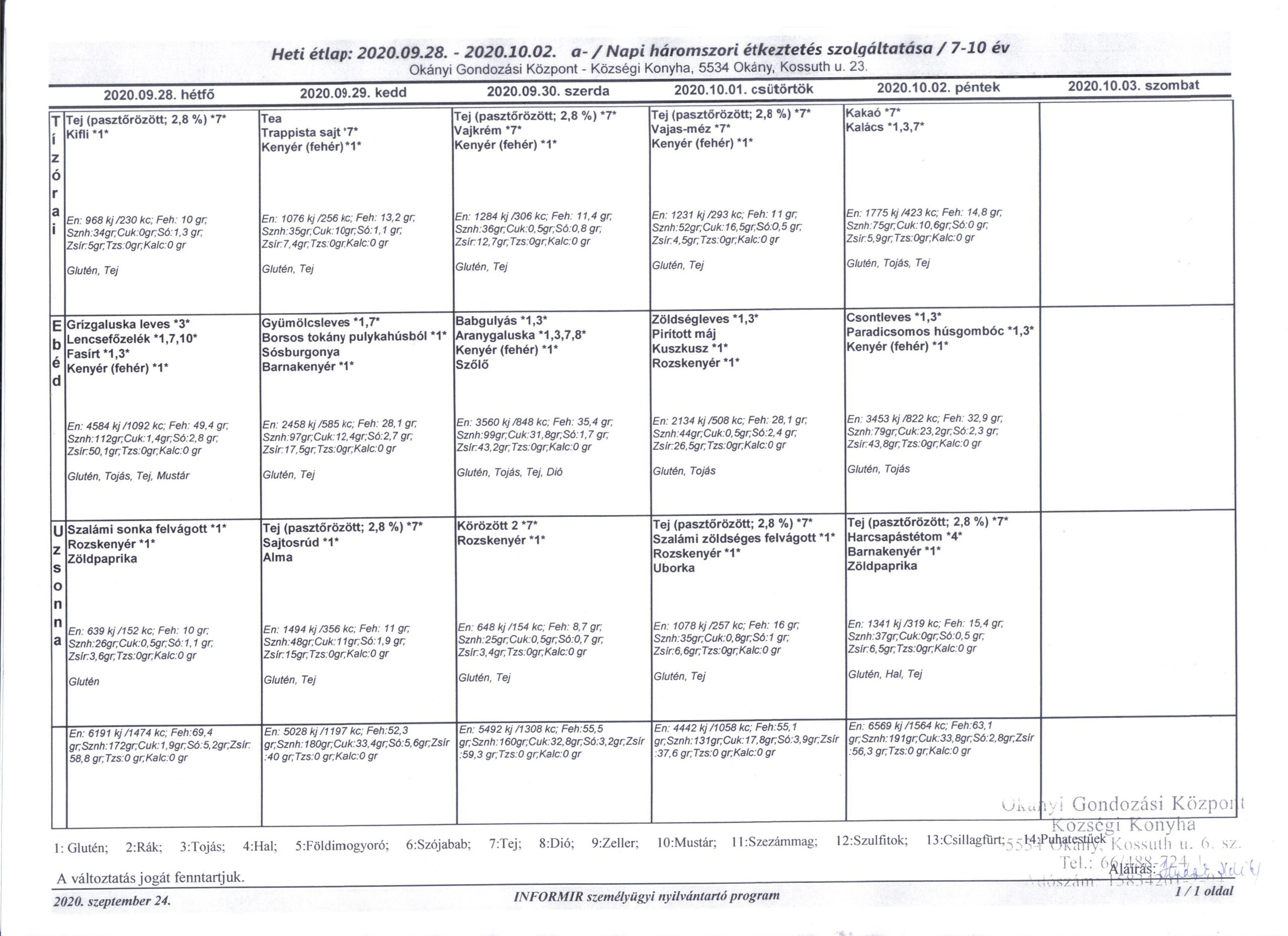 Konyha Étlap korosztályos bontásban 2020.09.28. – 2020.10.02.