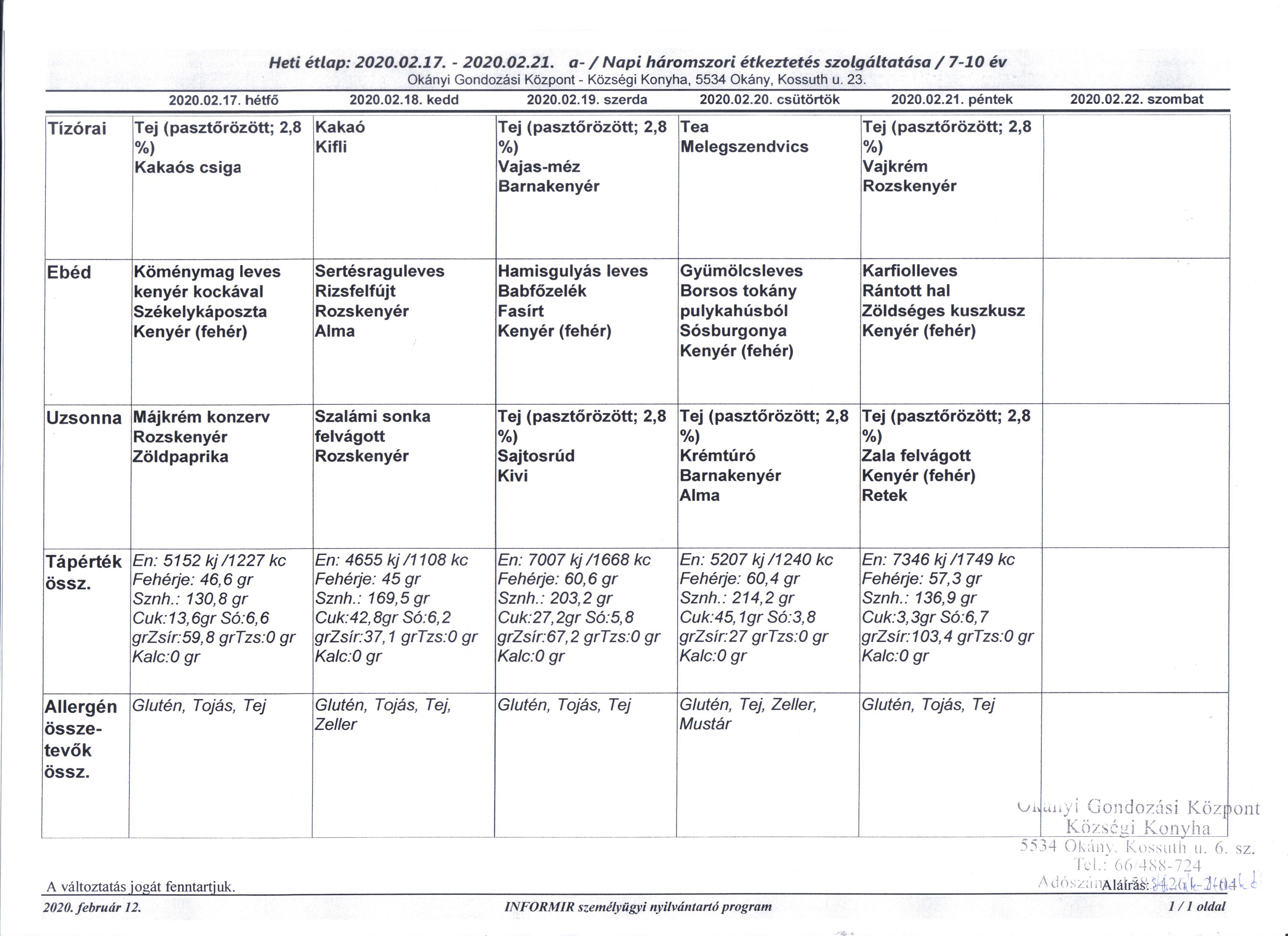 Konyha Étlap korosztályos bontásban 2020.02.17.-2020.02.21.