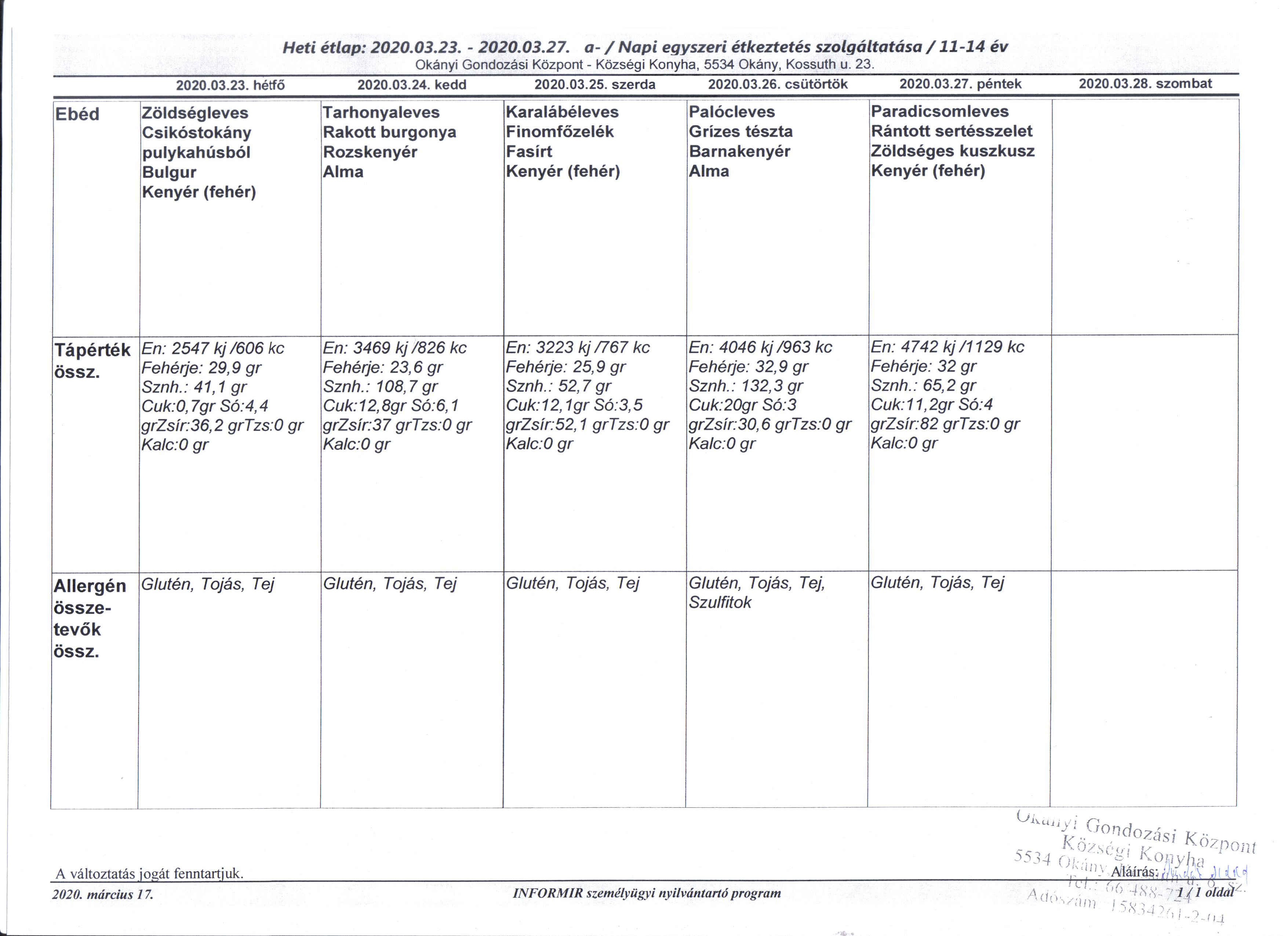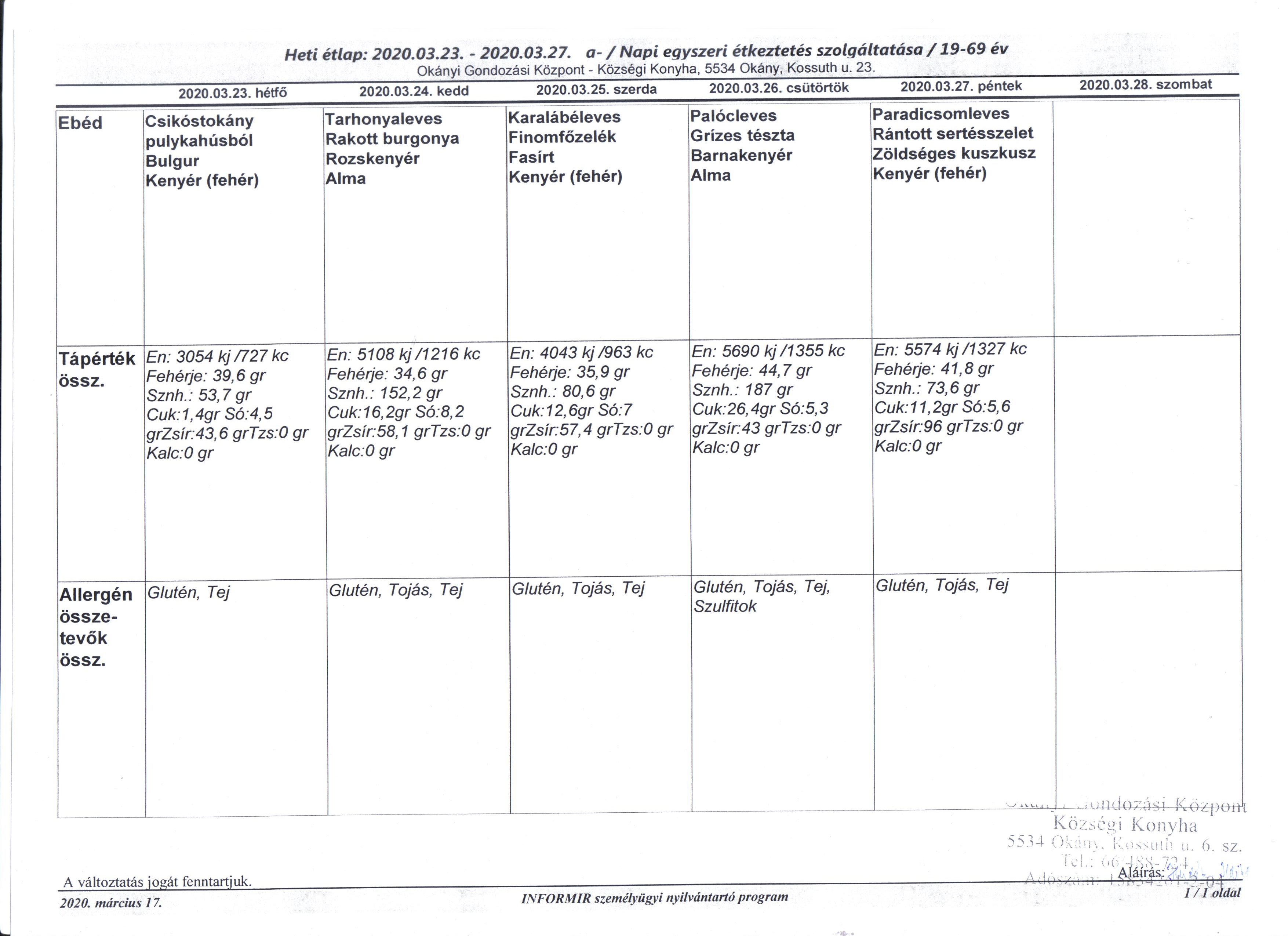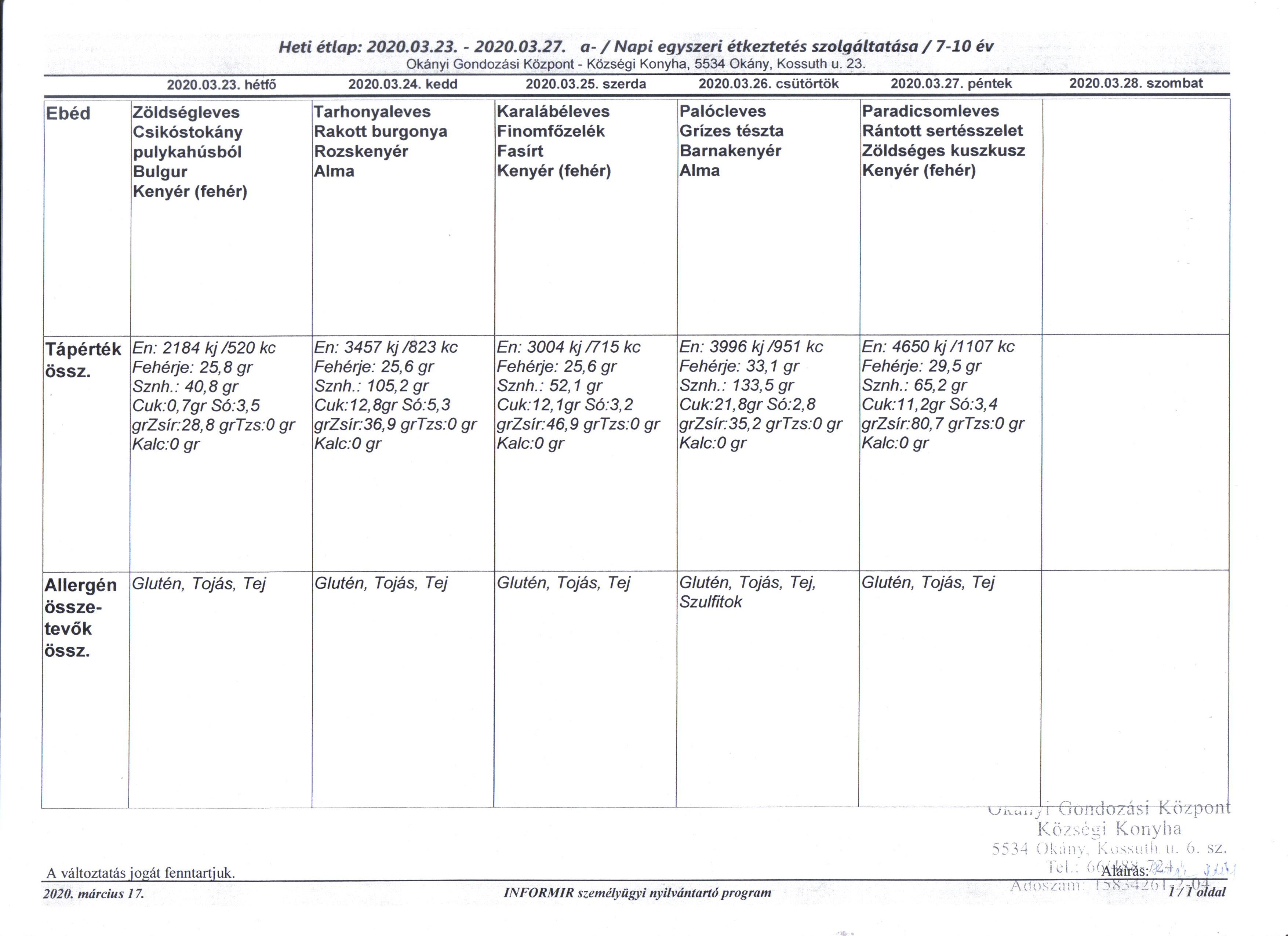 Konyha Étlap korosztályos bontásban 2020.03.23.-2020.03.27.