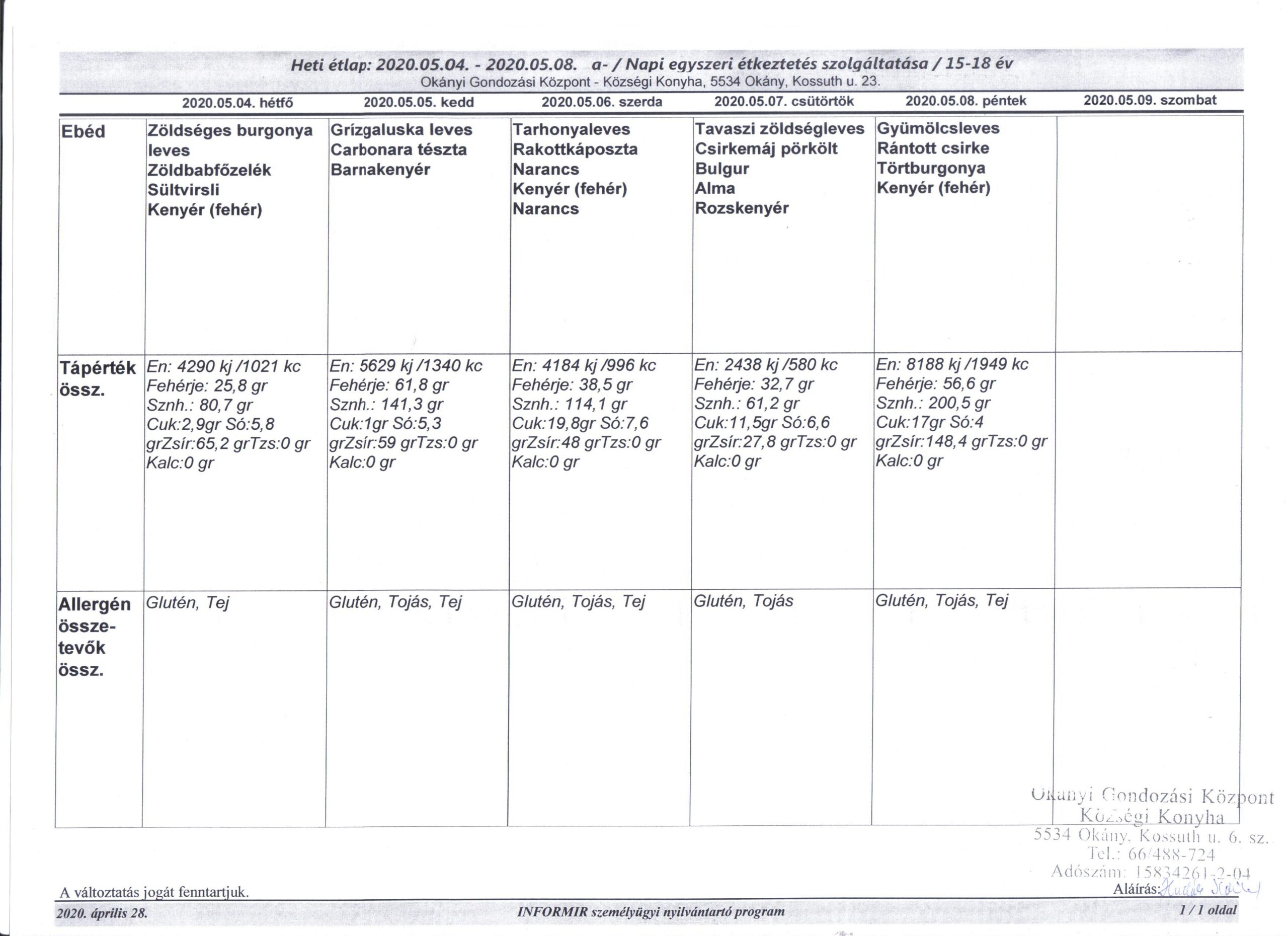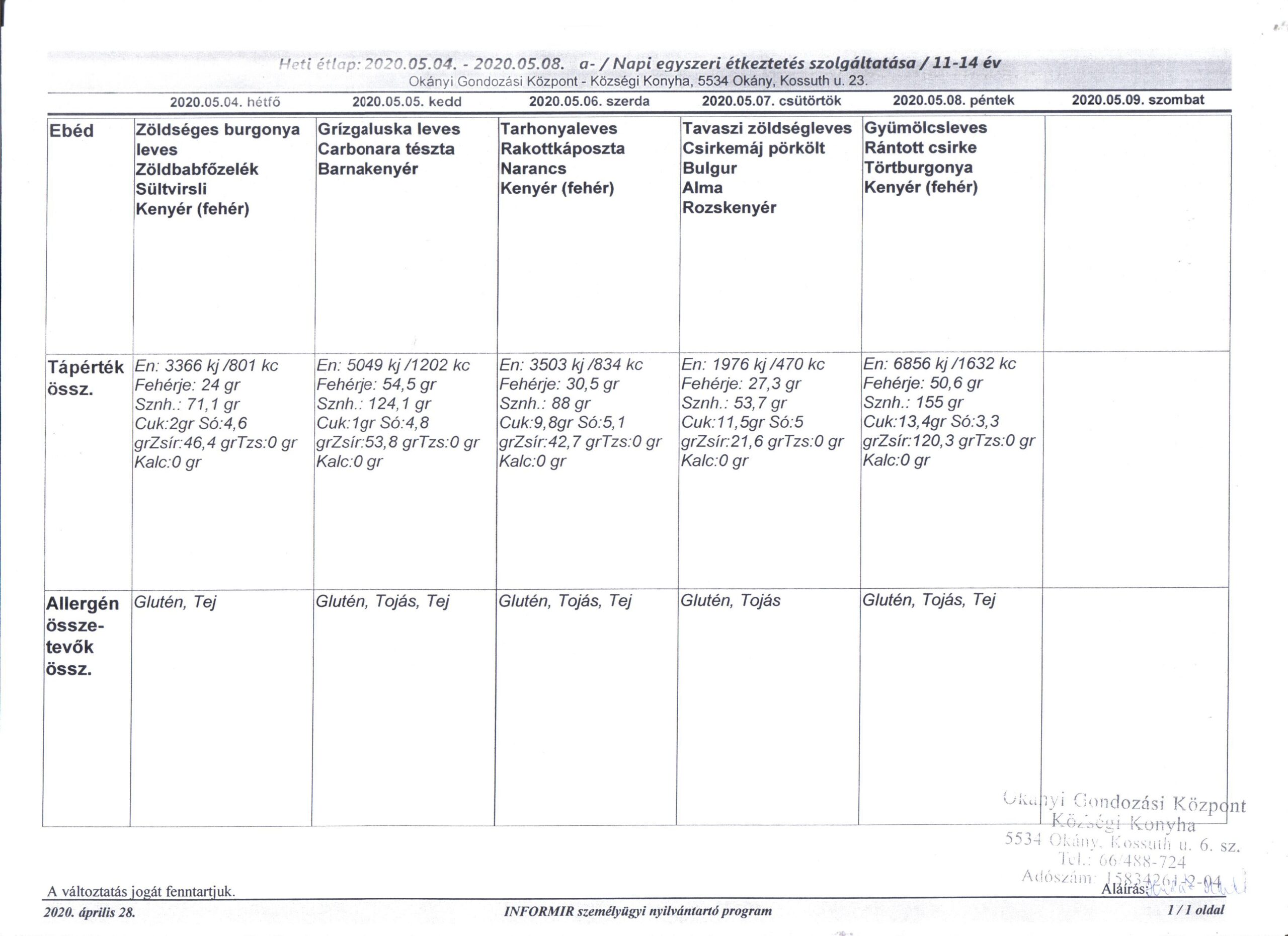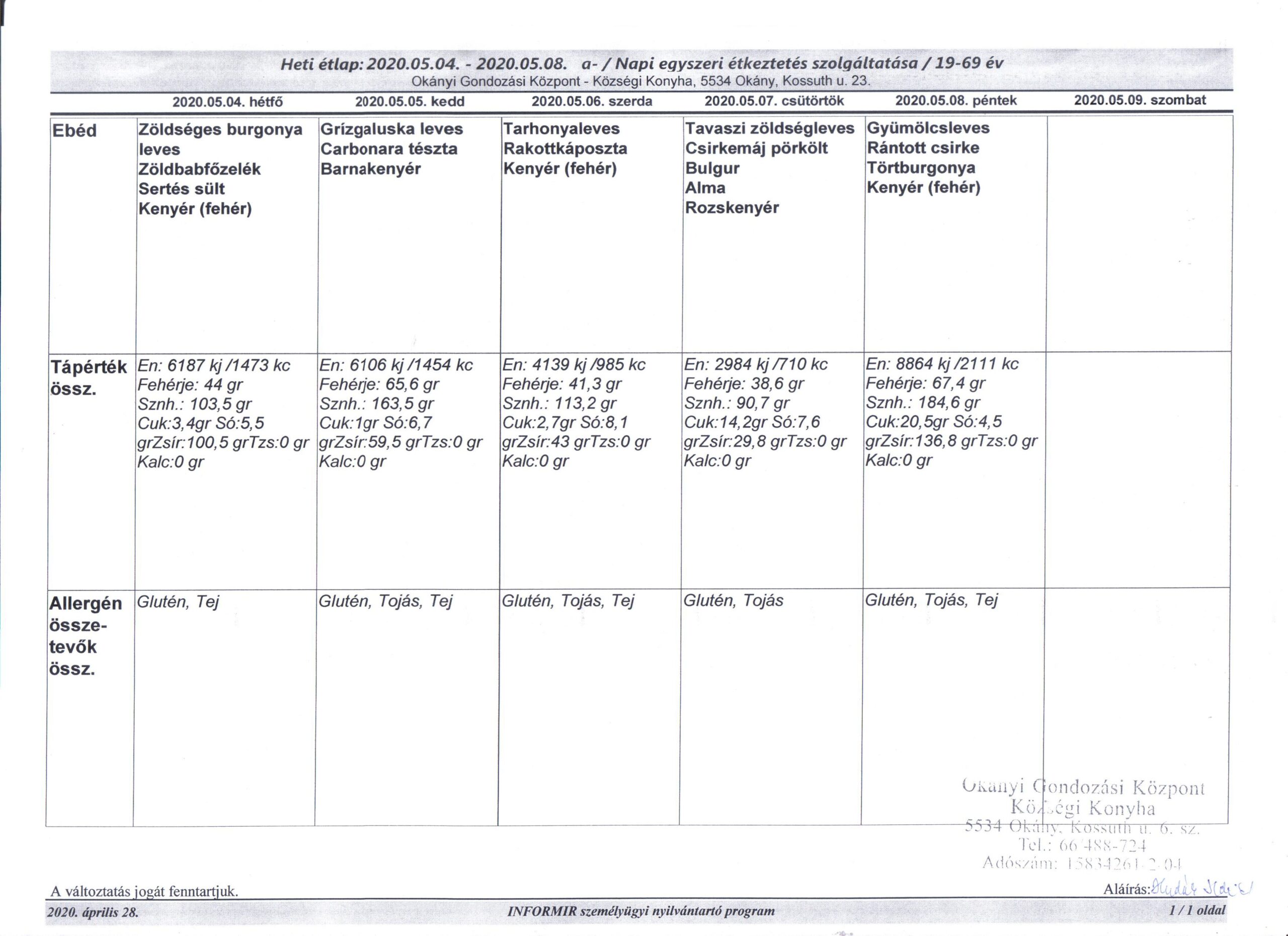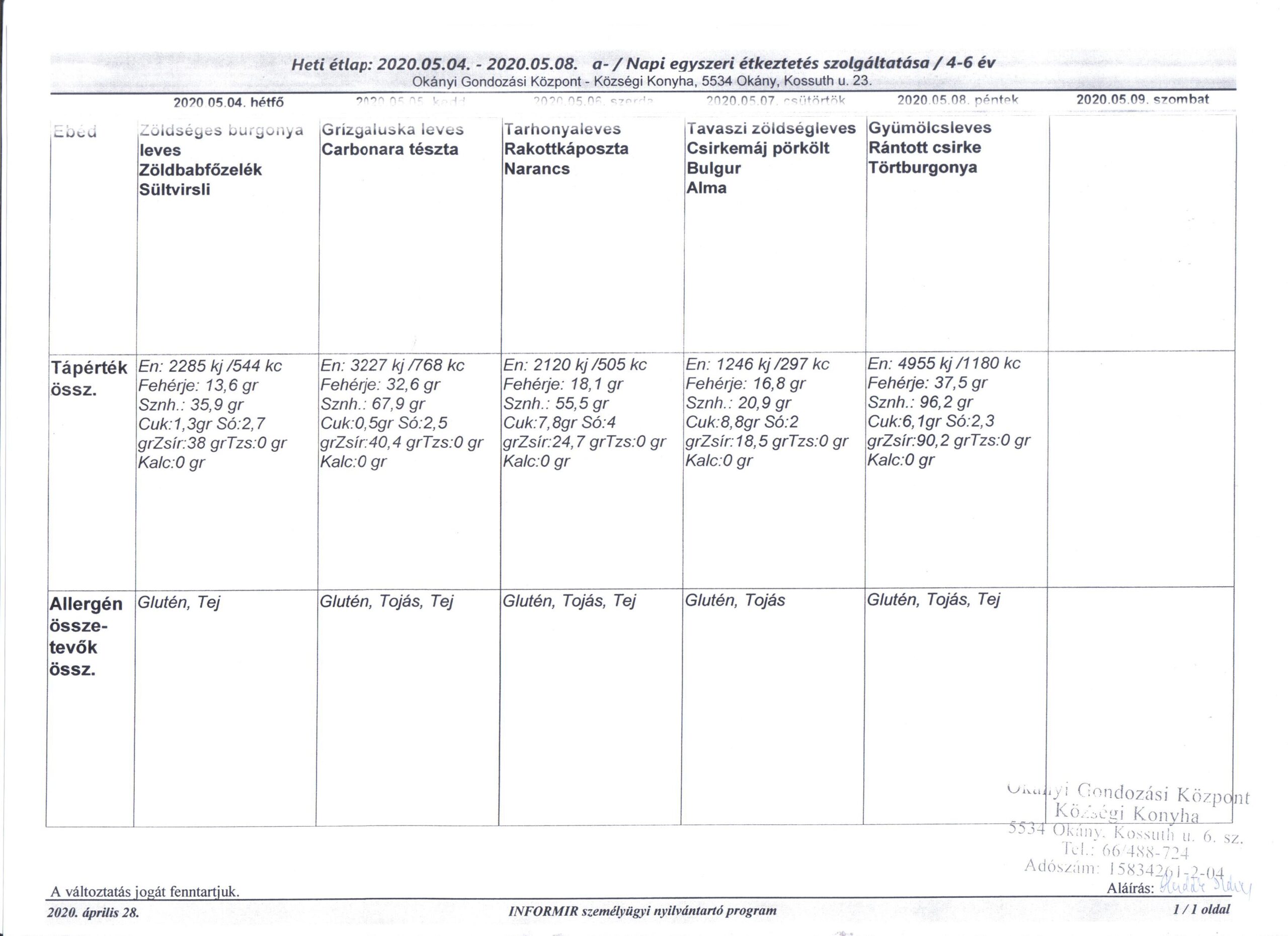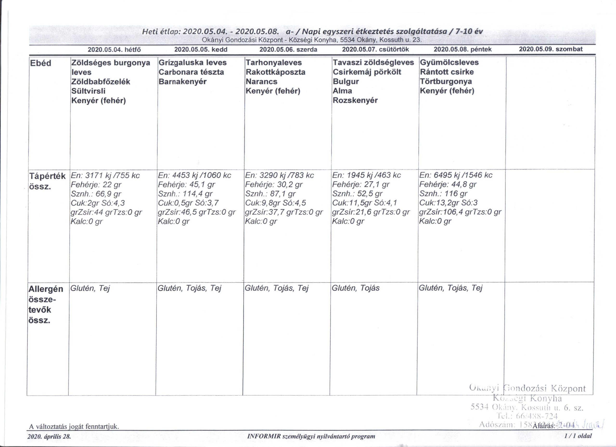 Konyha Étlap korosztályos bontásban 2020.05.04.-2020.05.08.