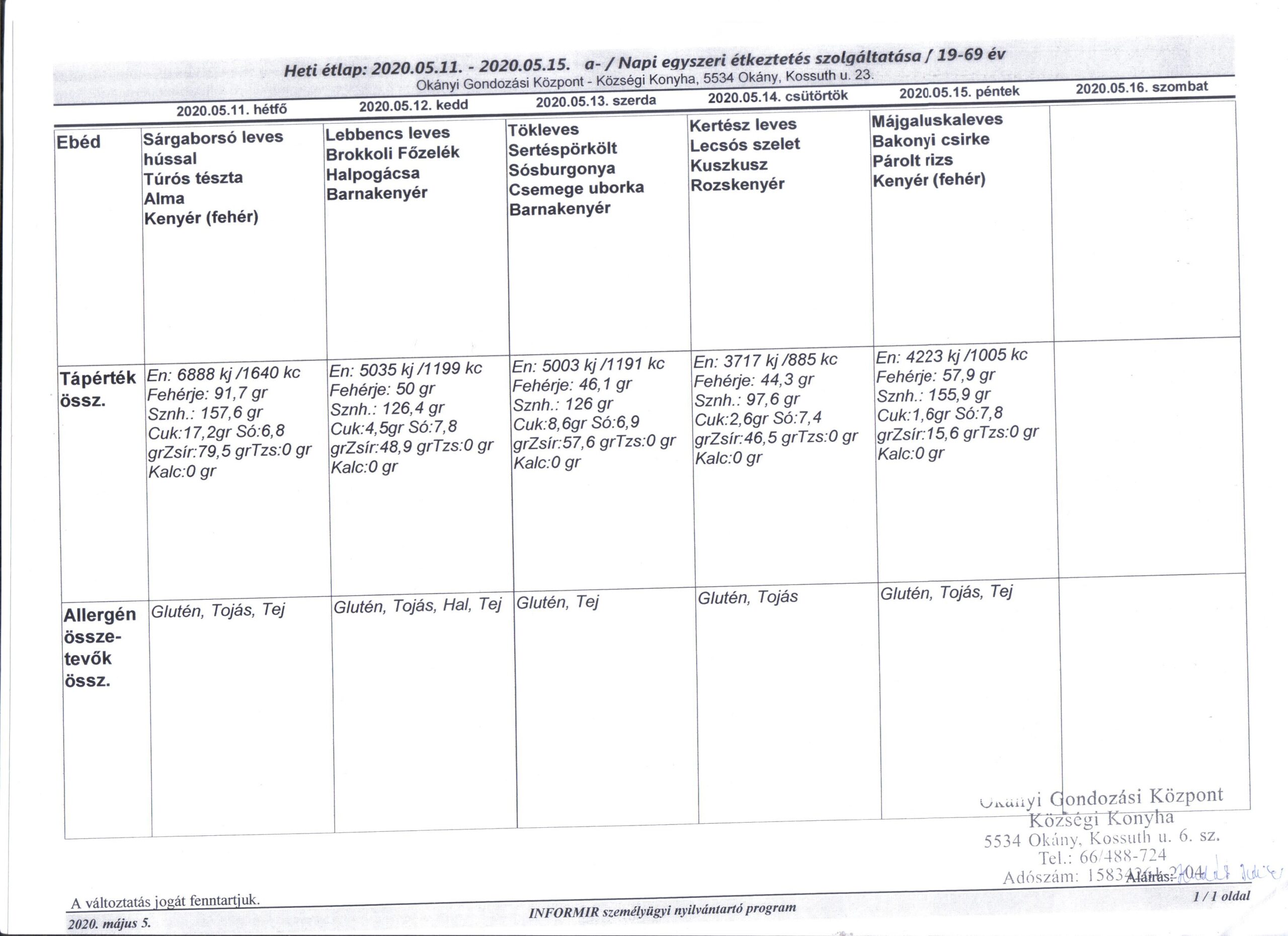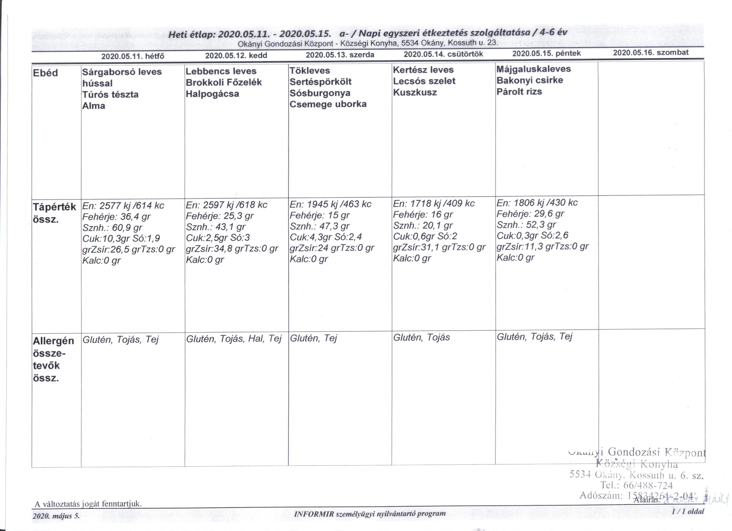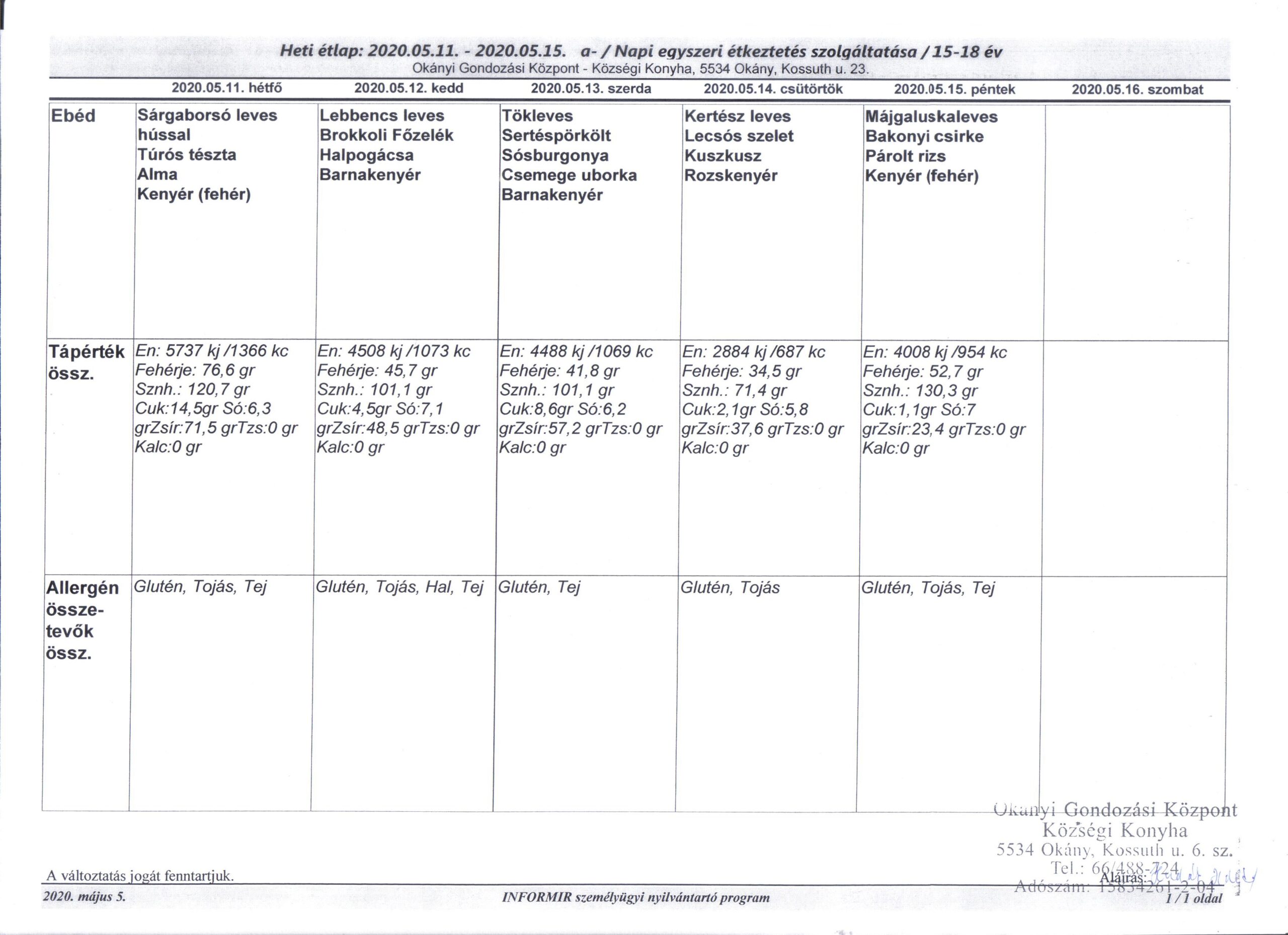 Konyha Étlap korosztályos bontásban 2020.05.11. – 2020.05.15.