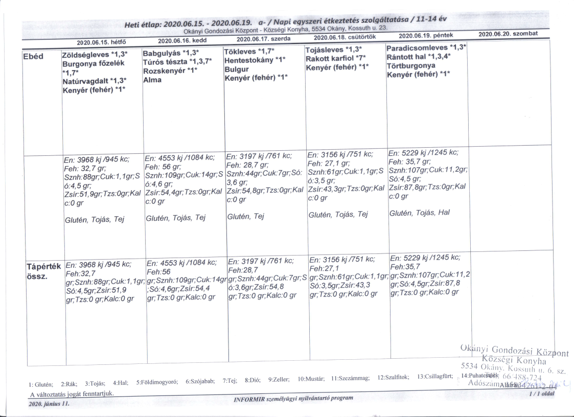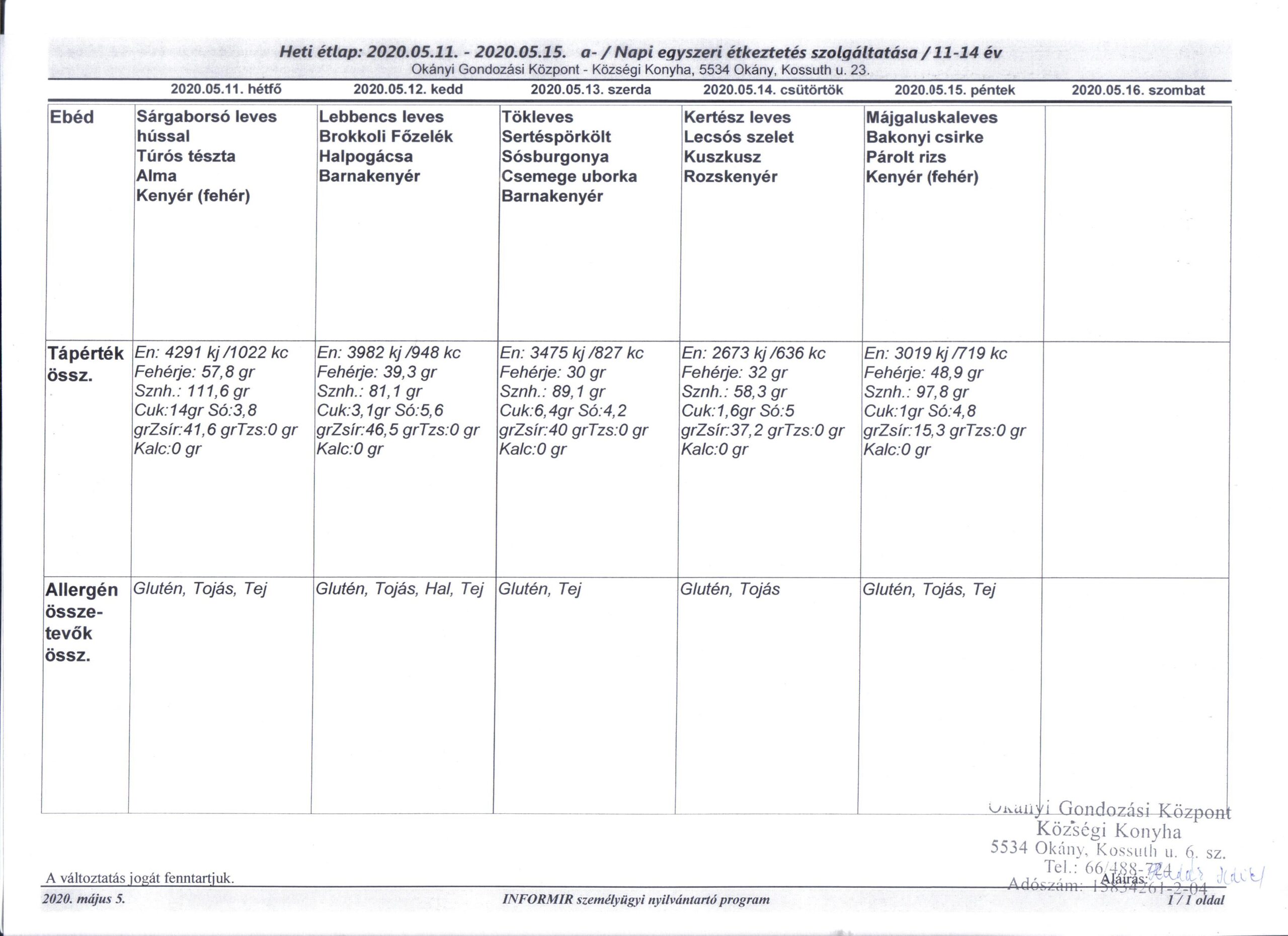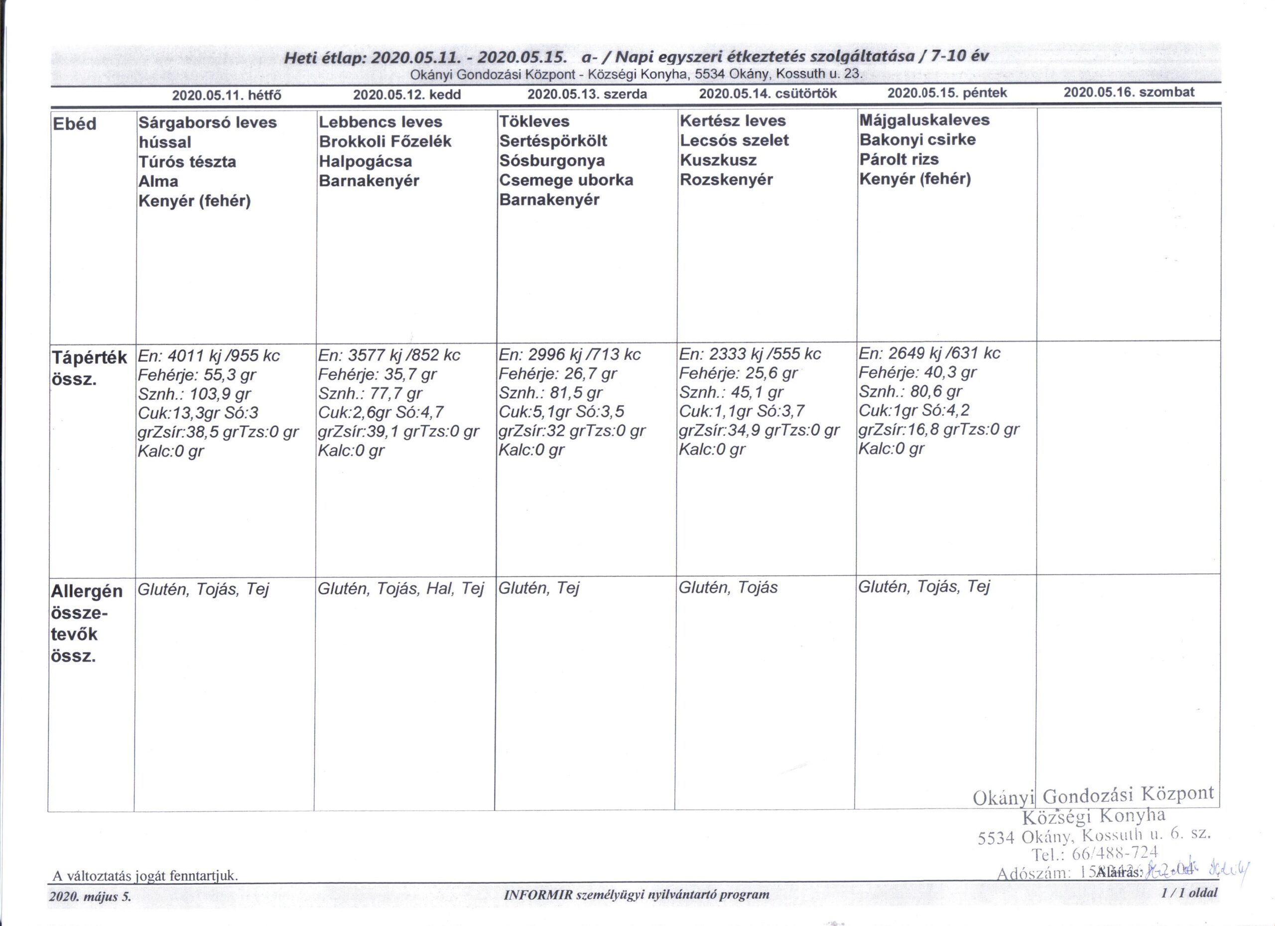 Konyha Étlap korosztályos bontásban 2020.05.11. – 2020.05.15.