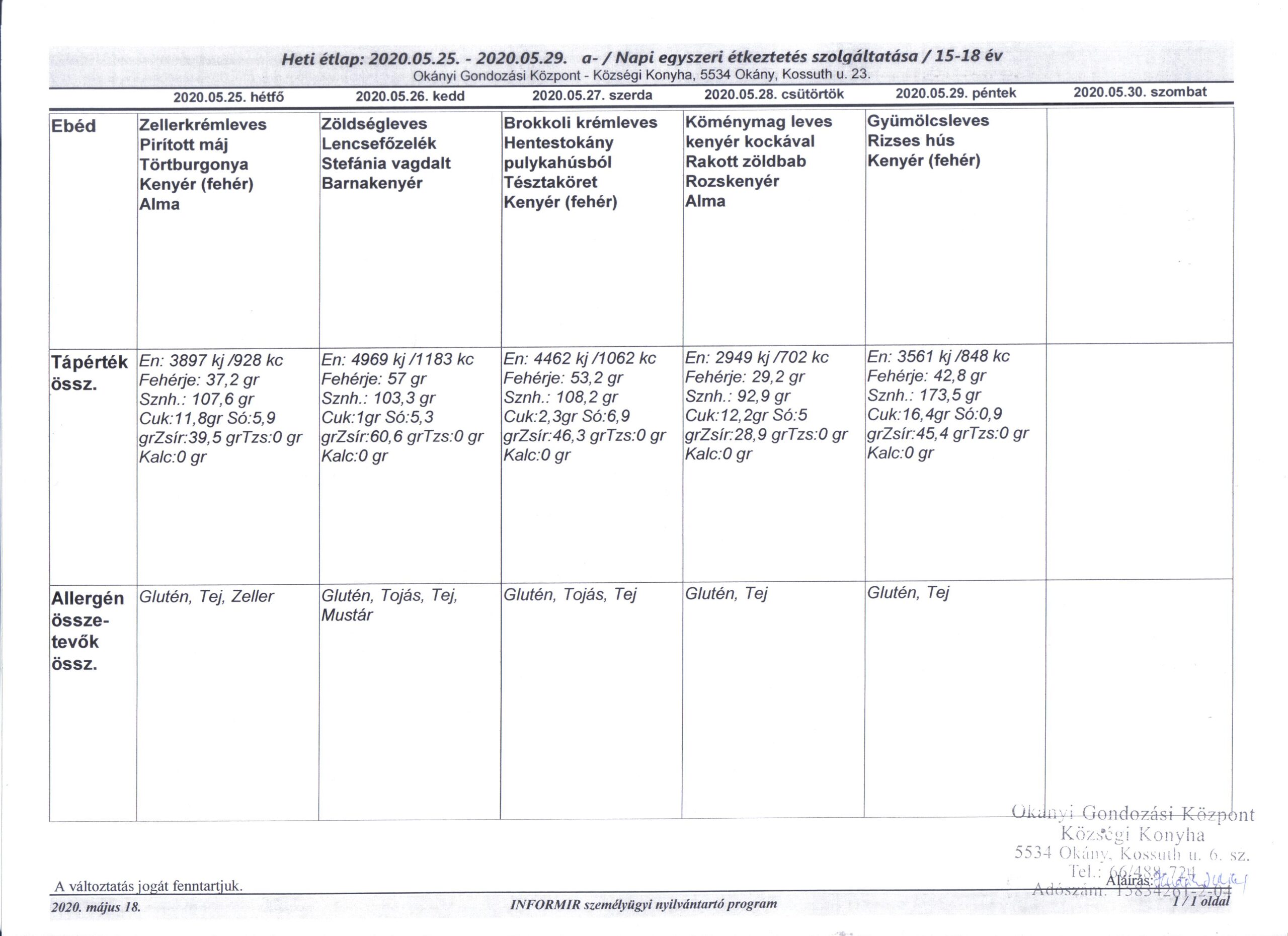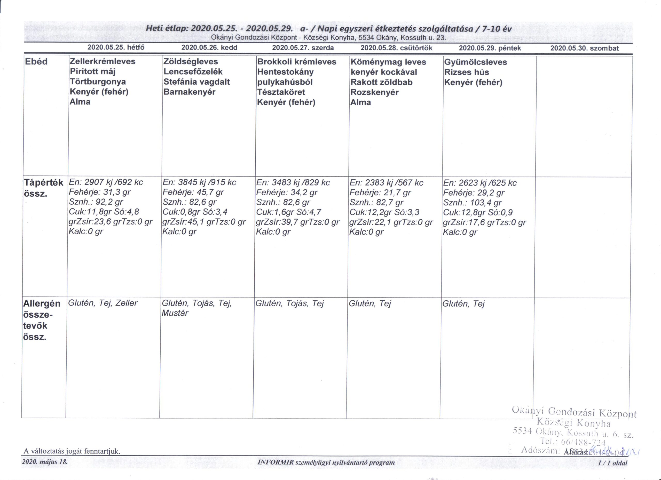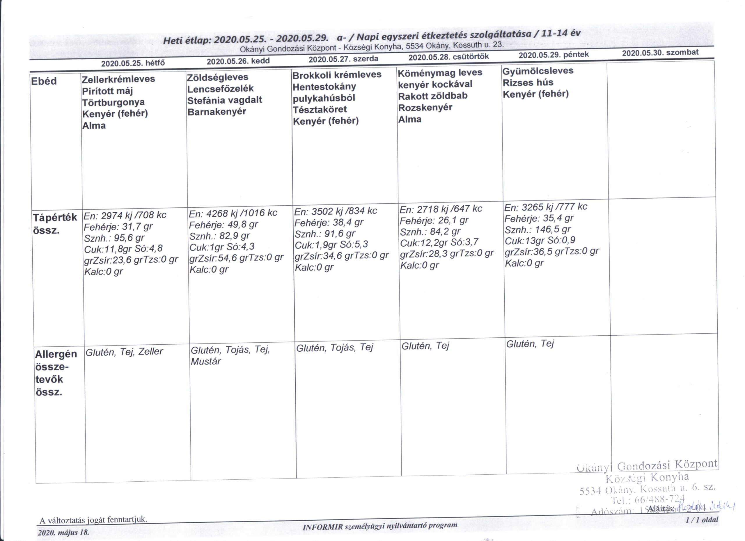 Konyha Étlap korosztályos bontásban 2020.05.25. – 2020.05.29.