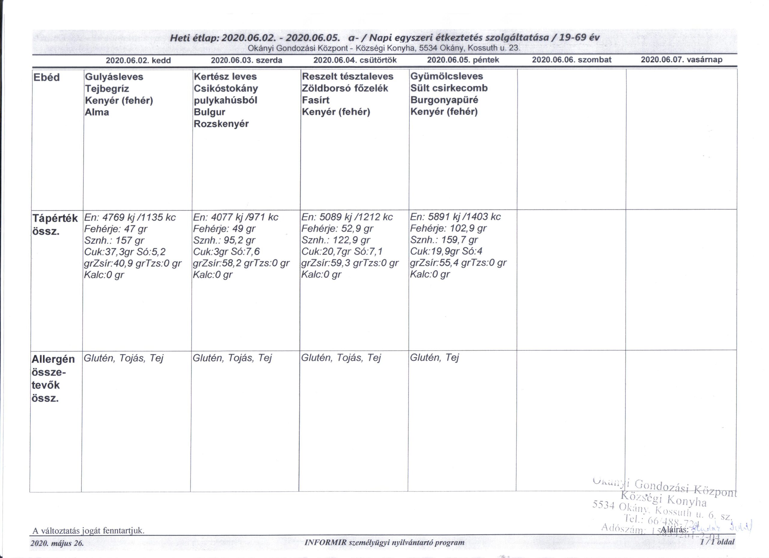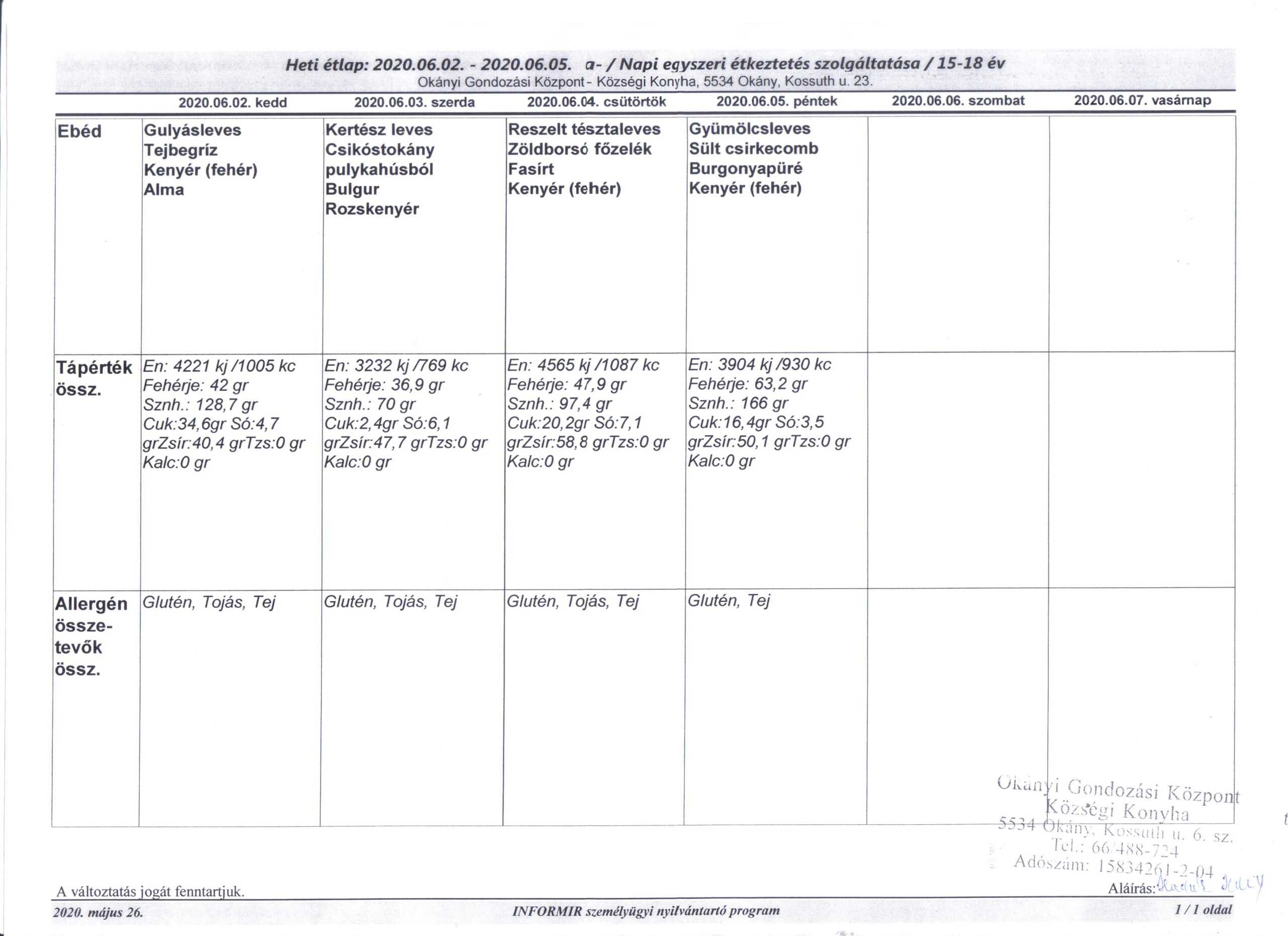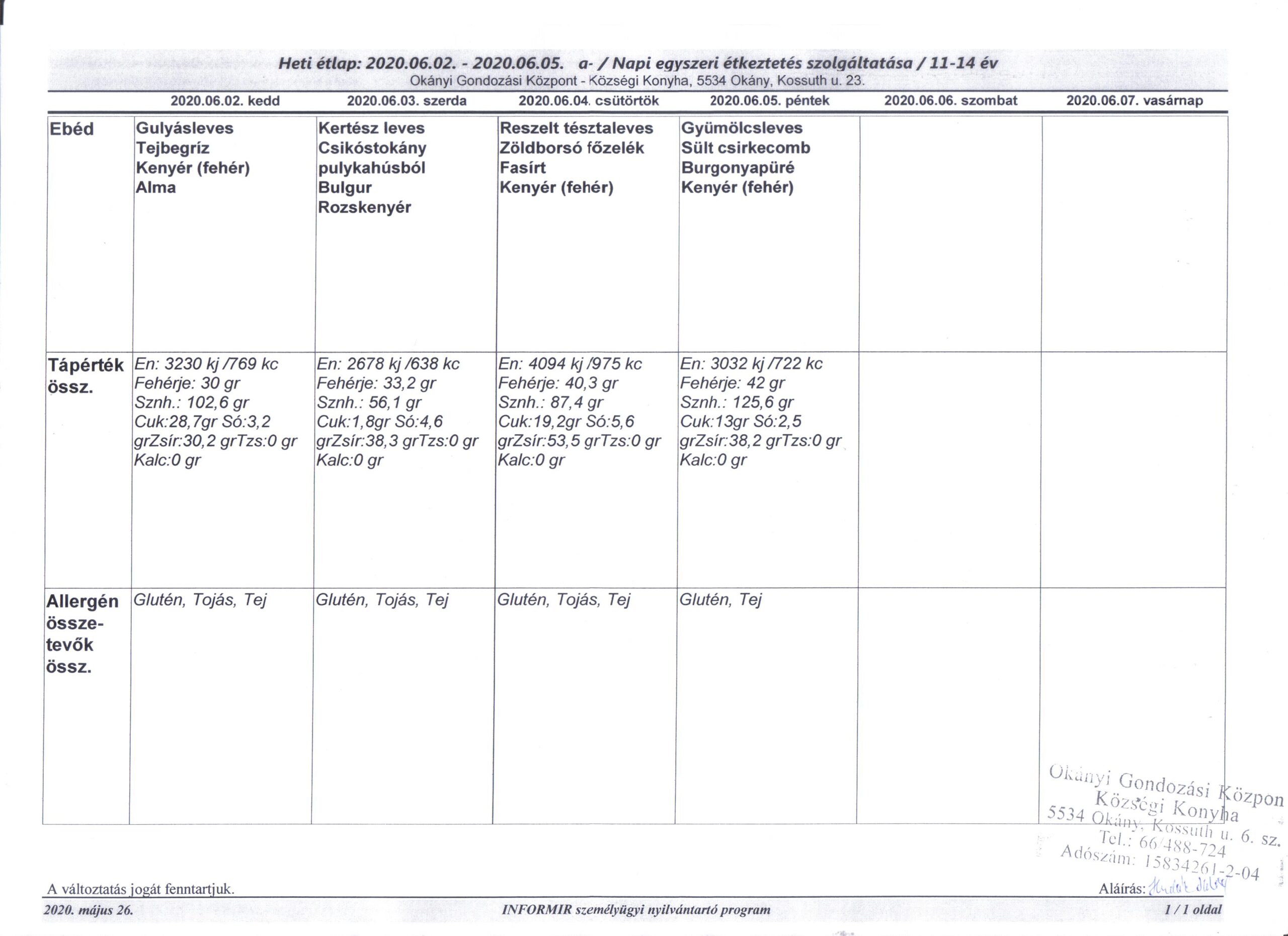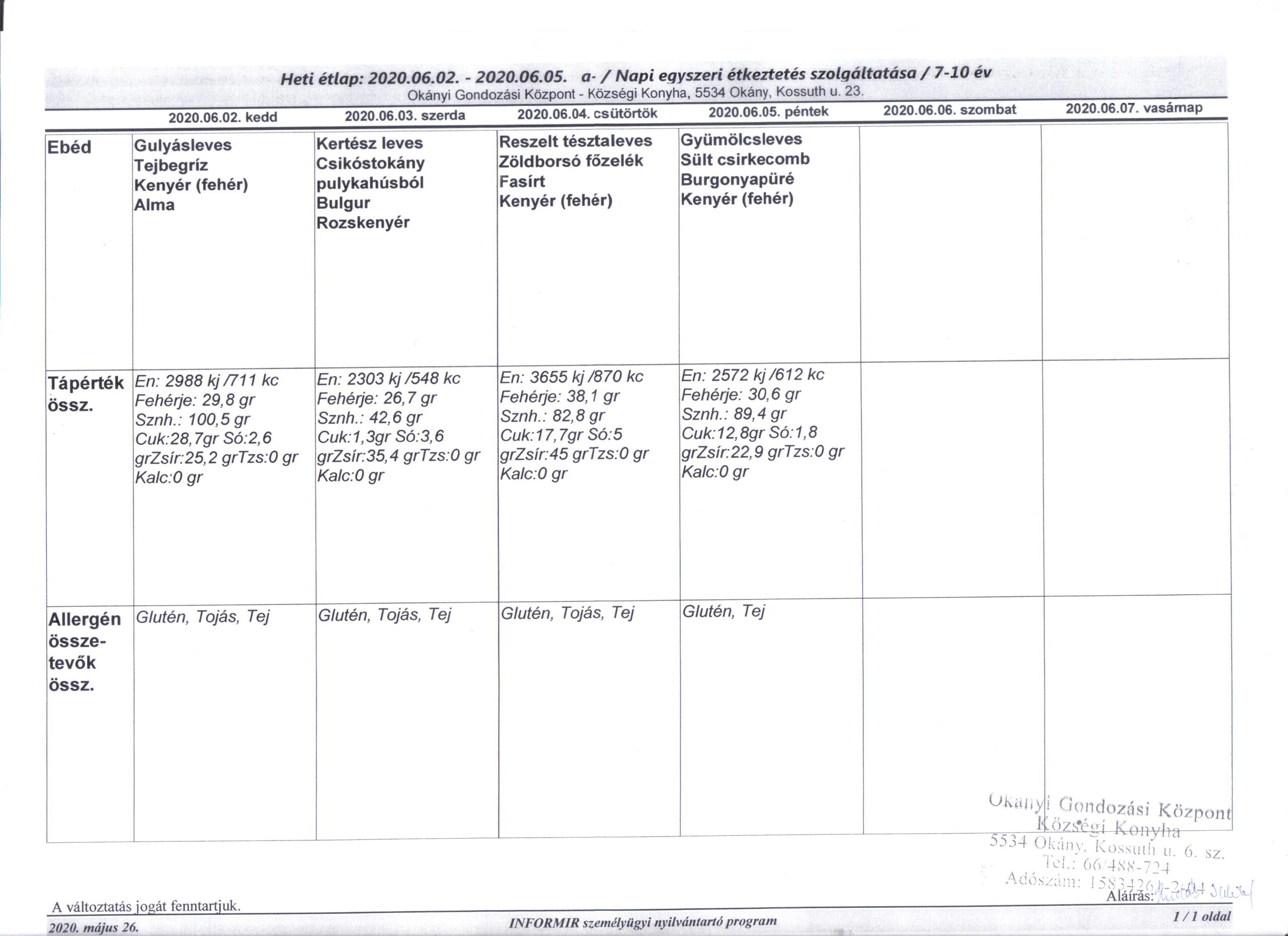 Konyha Étlap korosztályos bontásban 2020.05.25. – 2020.05.29.