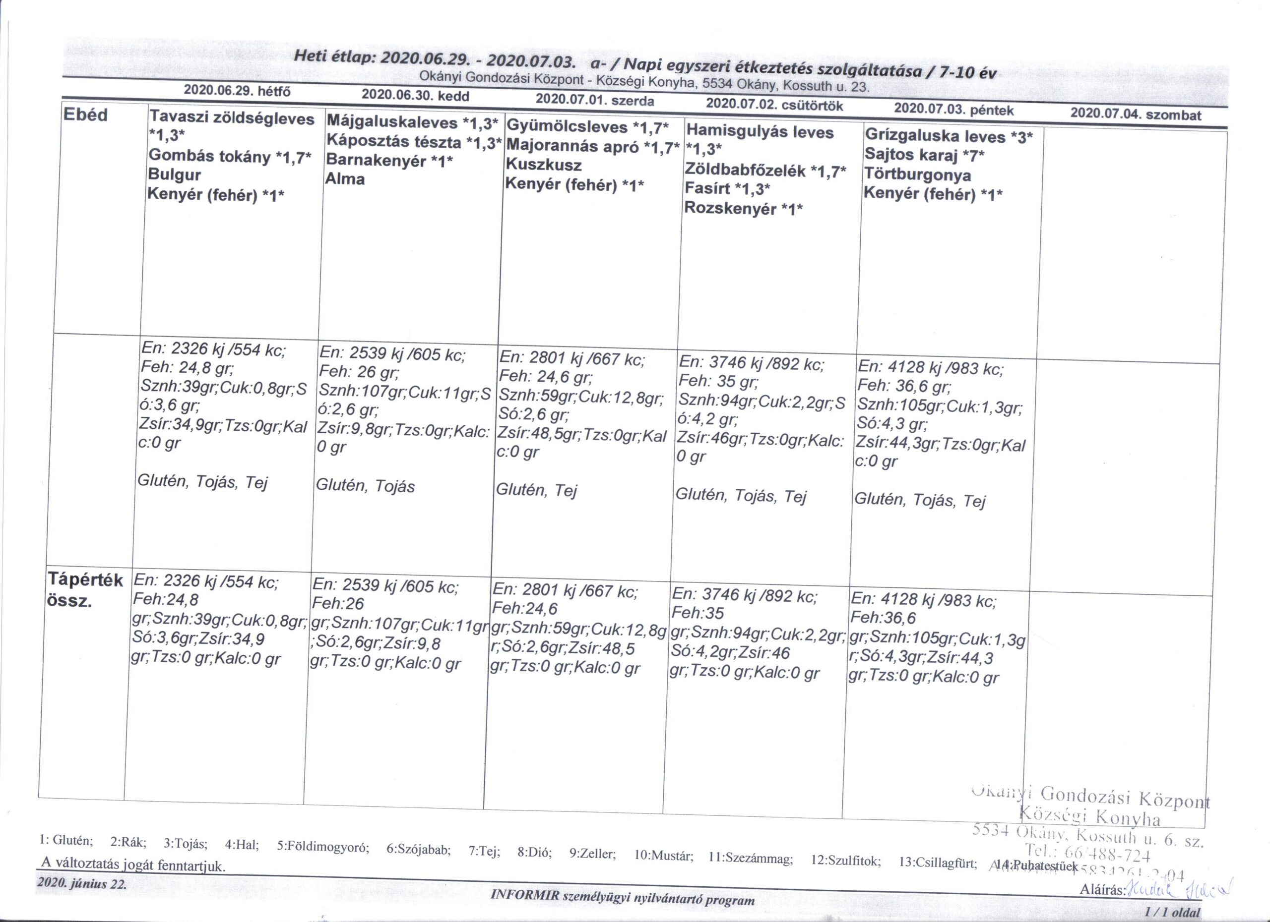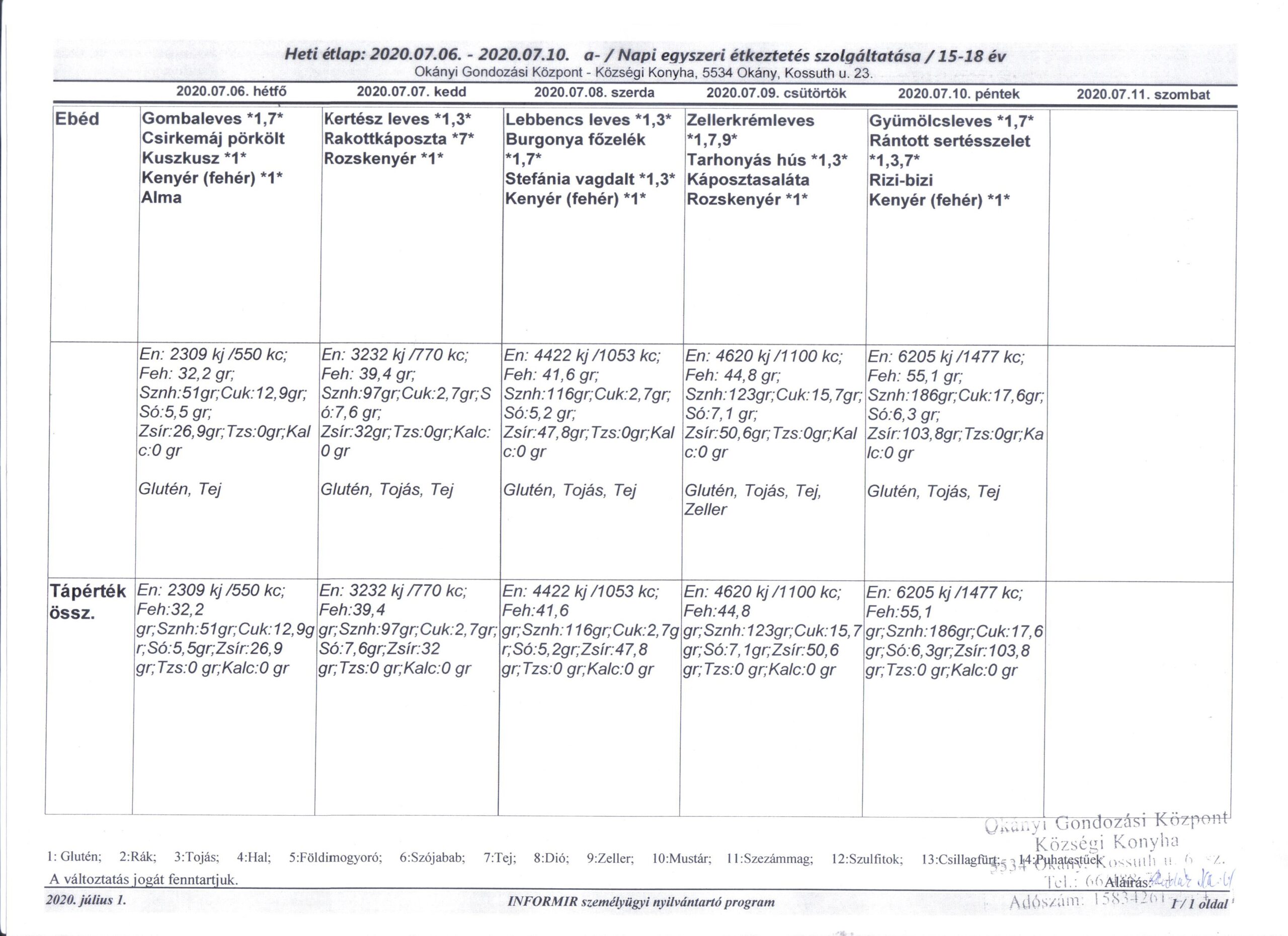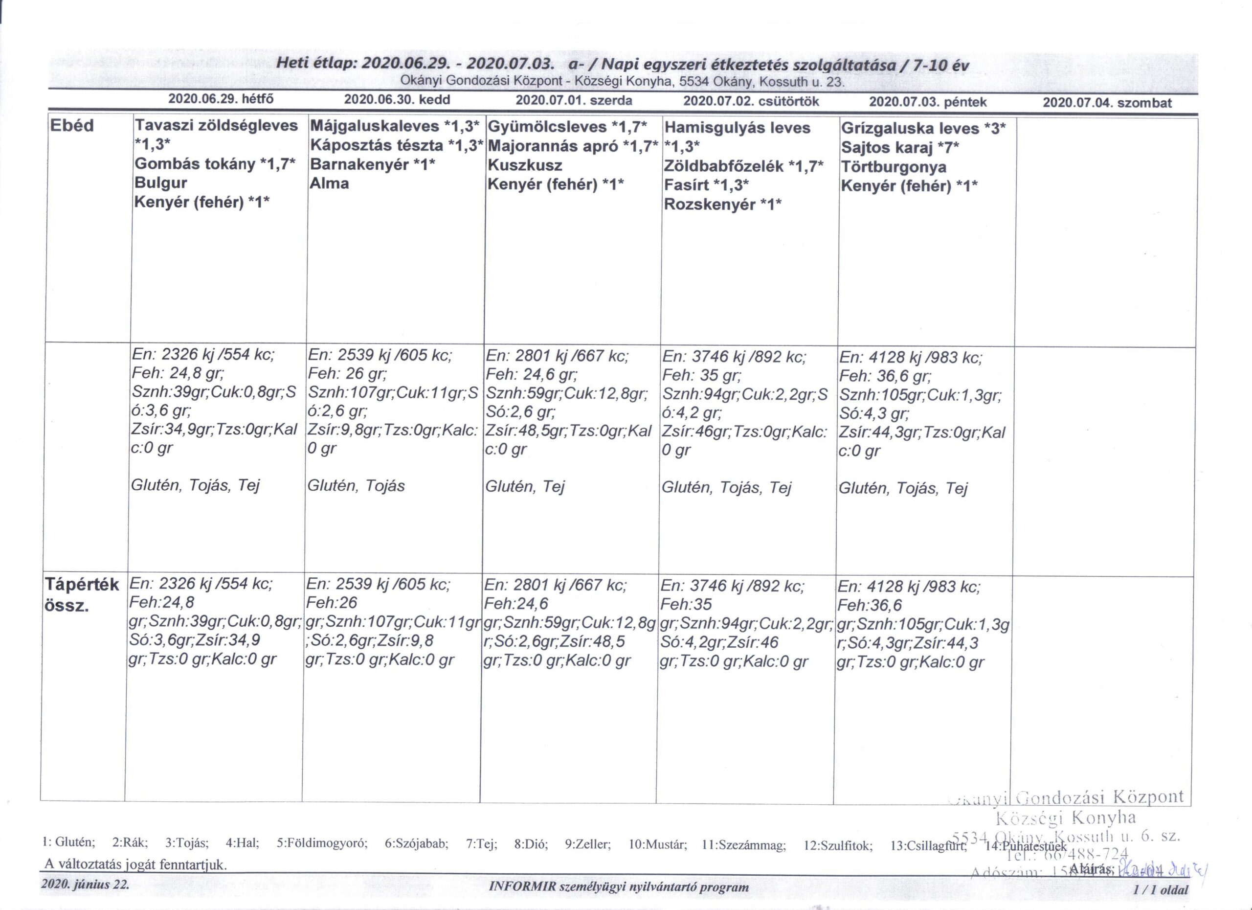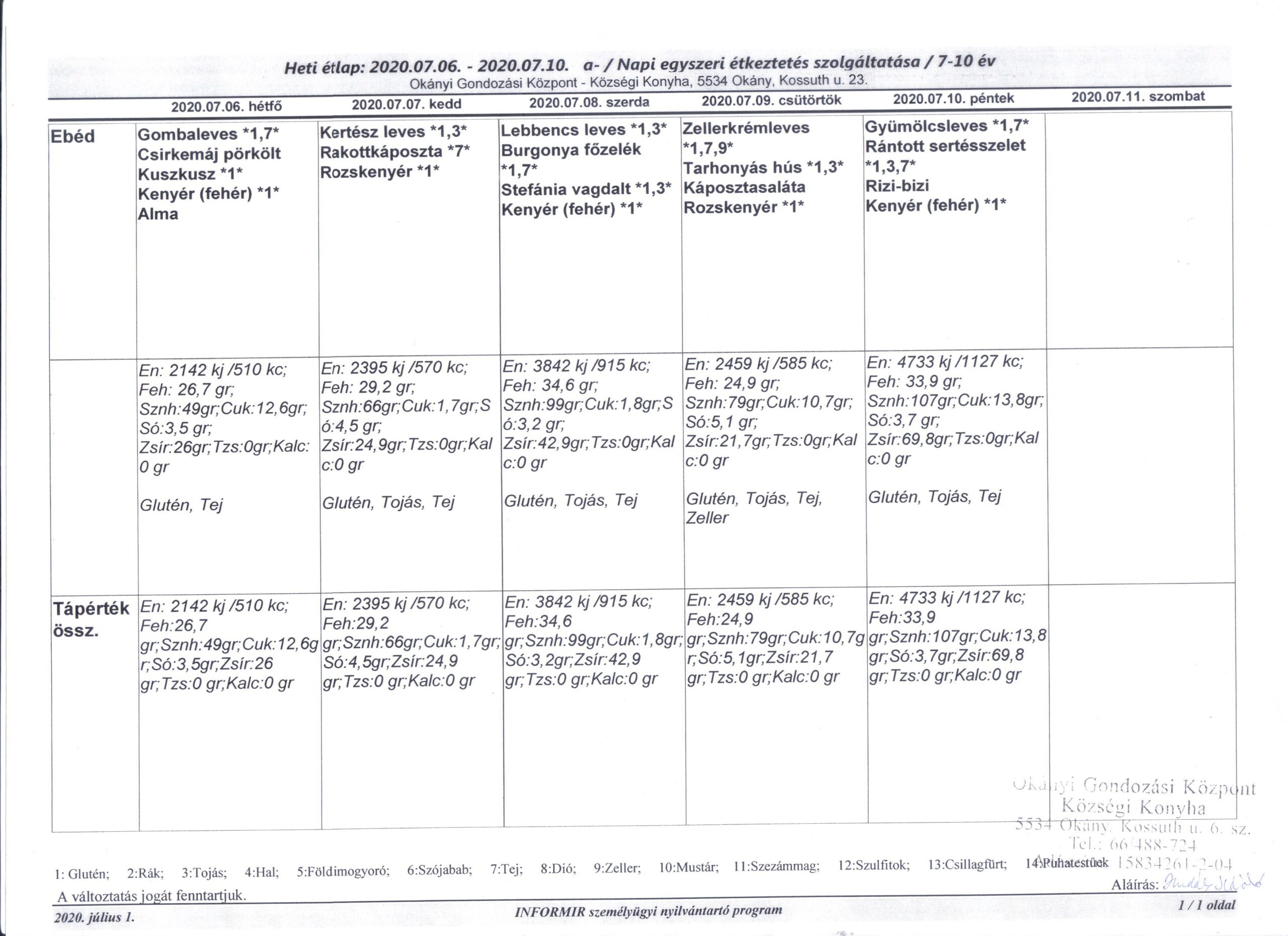 Konyha Étlap korosztályos bontásban 2020.07.06. – 2020.07.10.