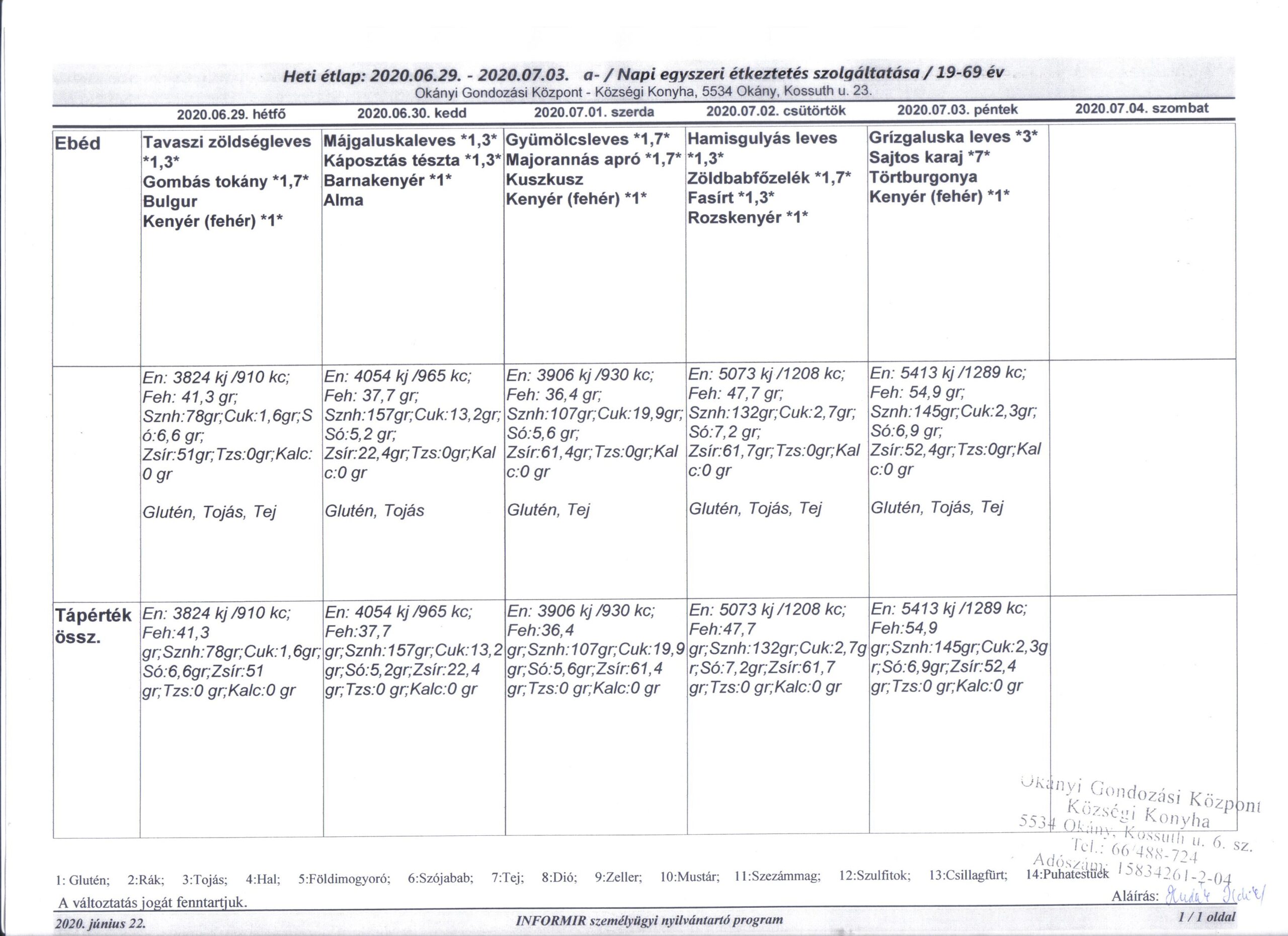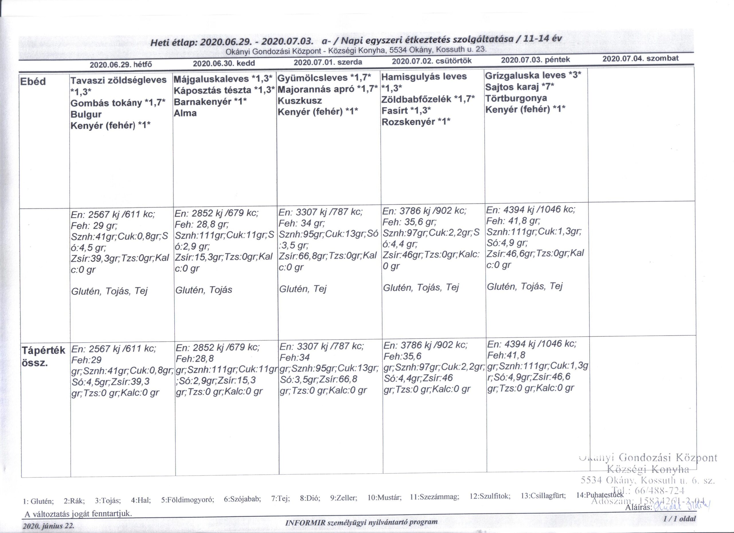 Konyha Étlap korosztályos bontásban 2020.06.29. – 2020.07.03.