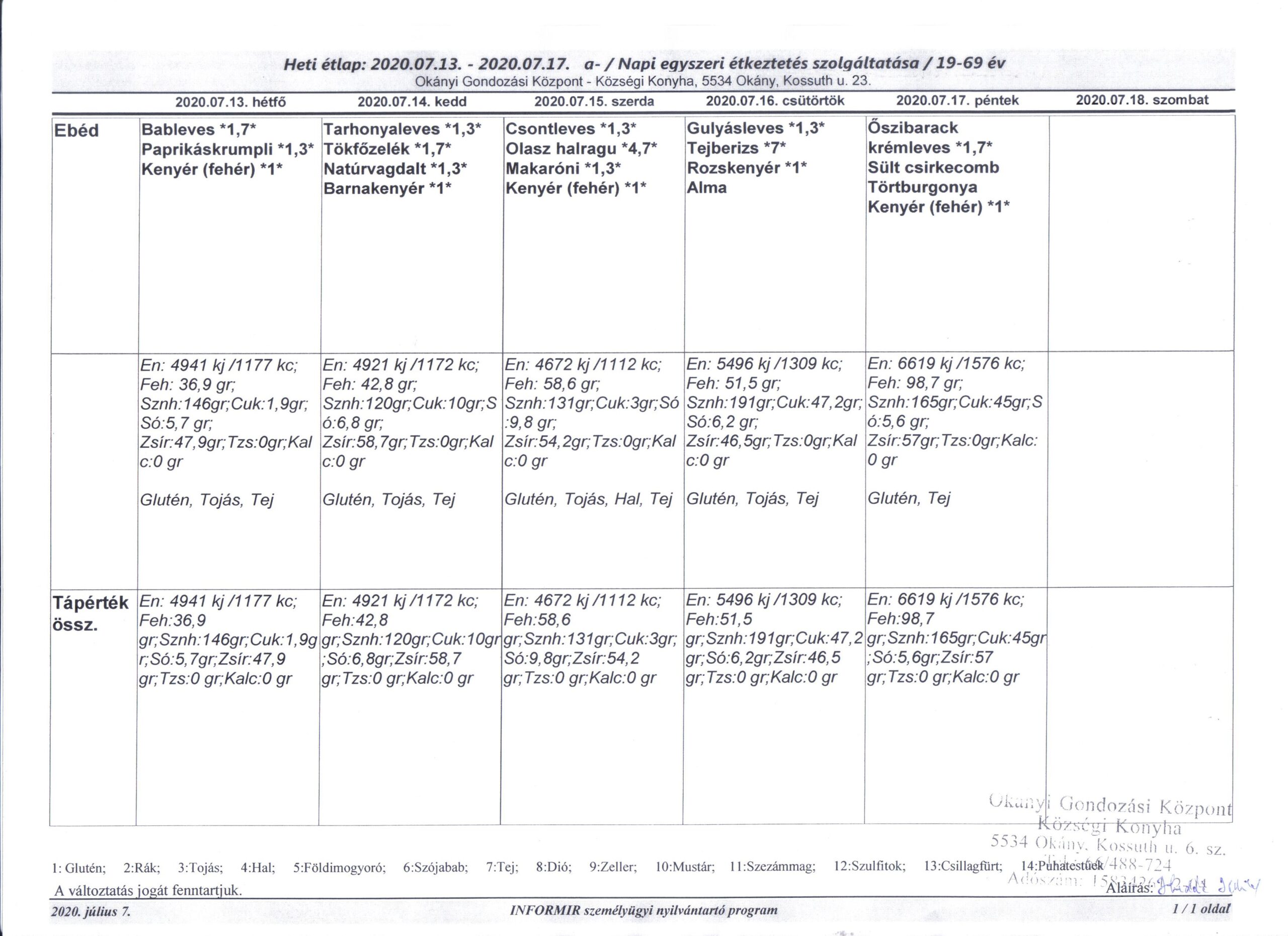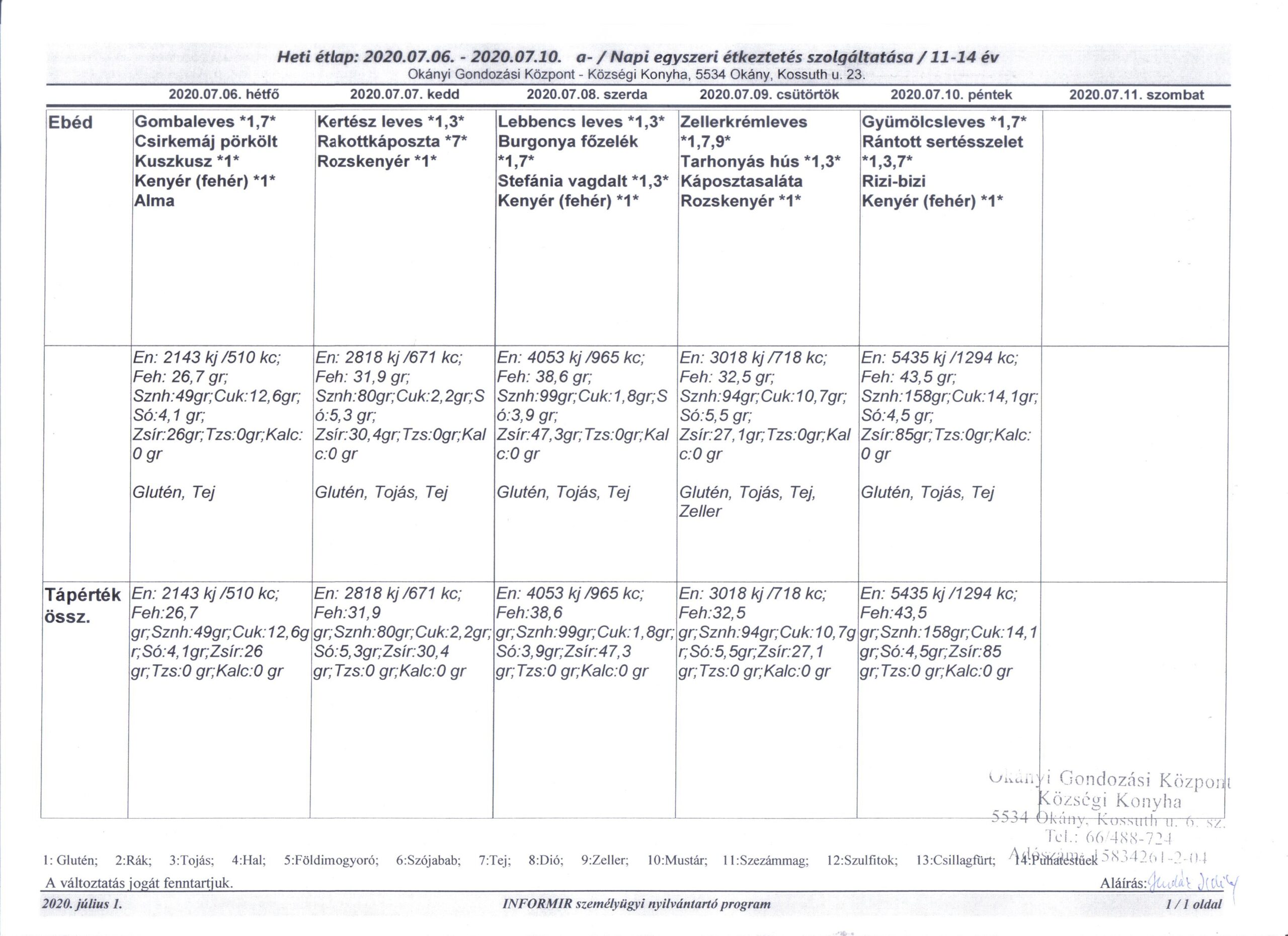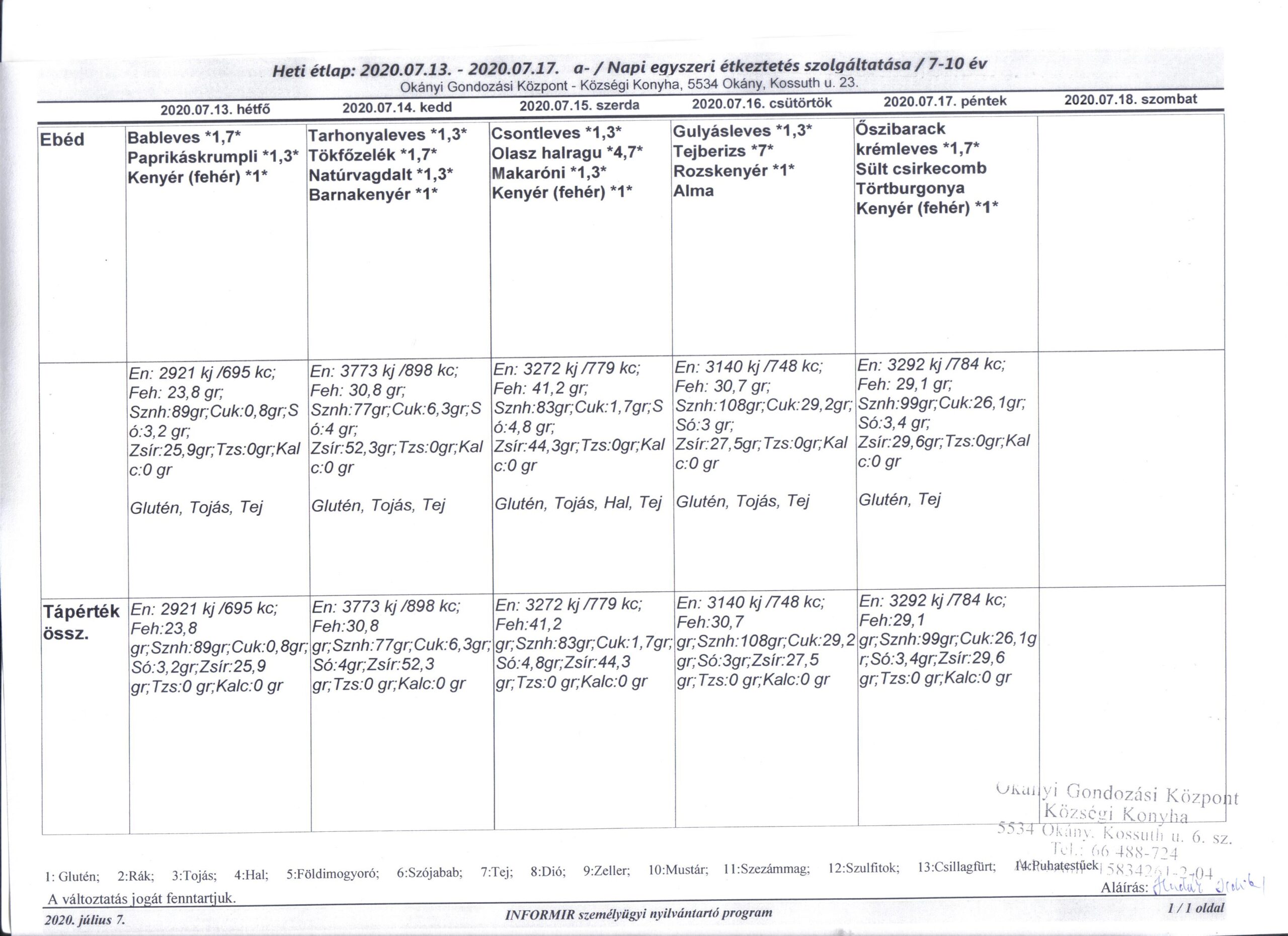 Konyha Étlap korosztályos bontásban 2020.07.13. – 2020.07.17.