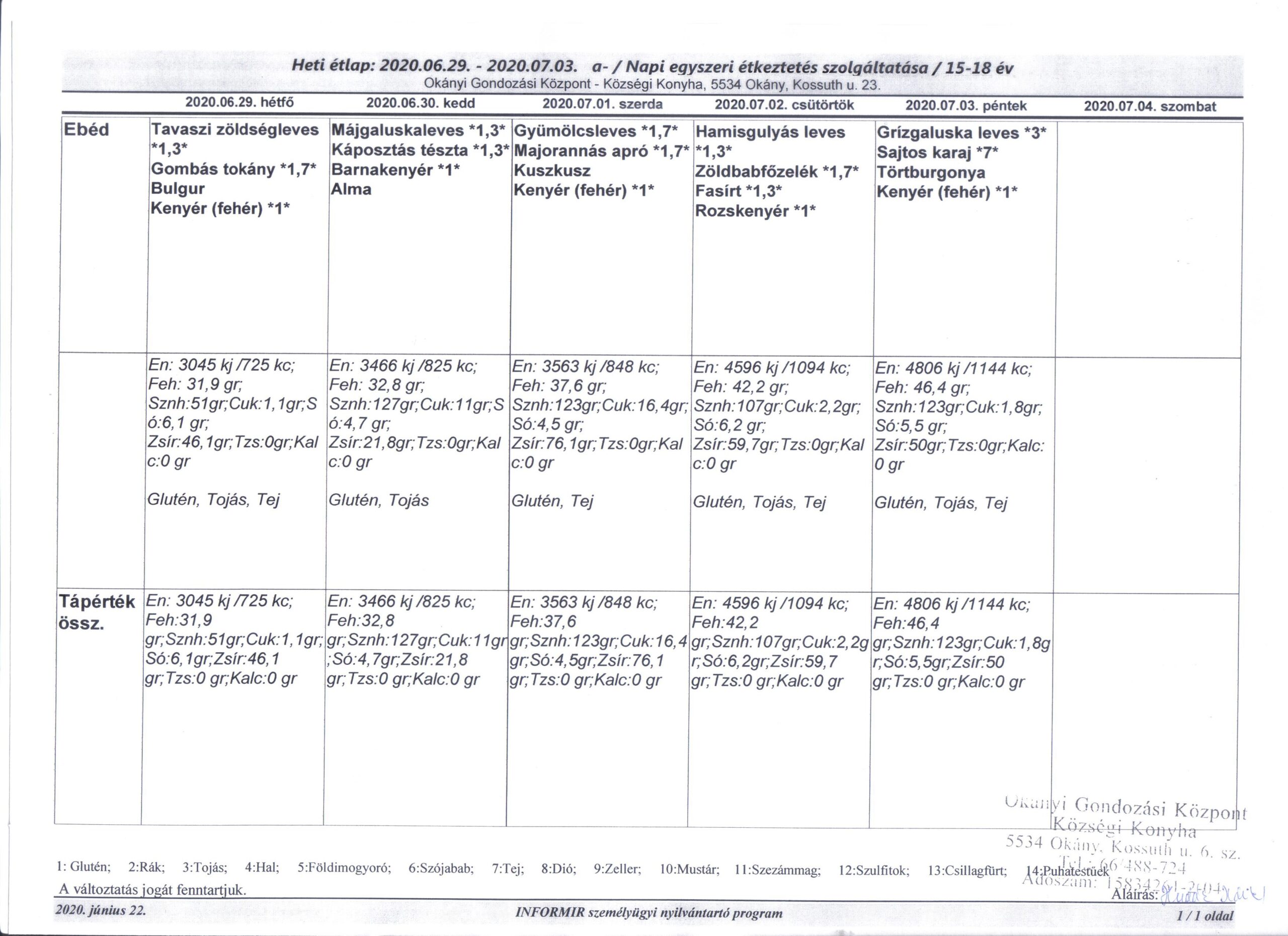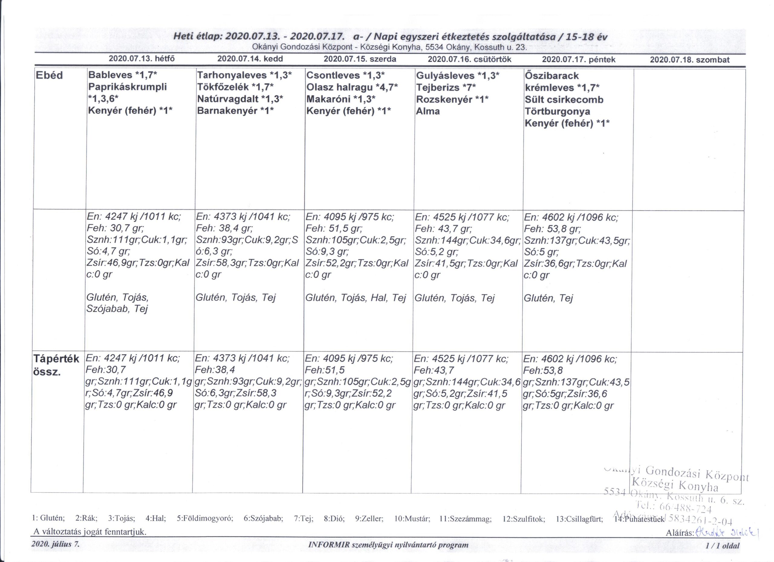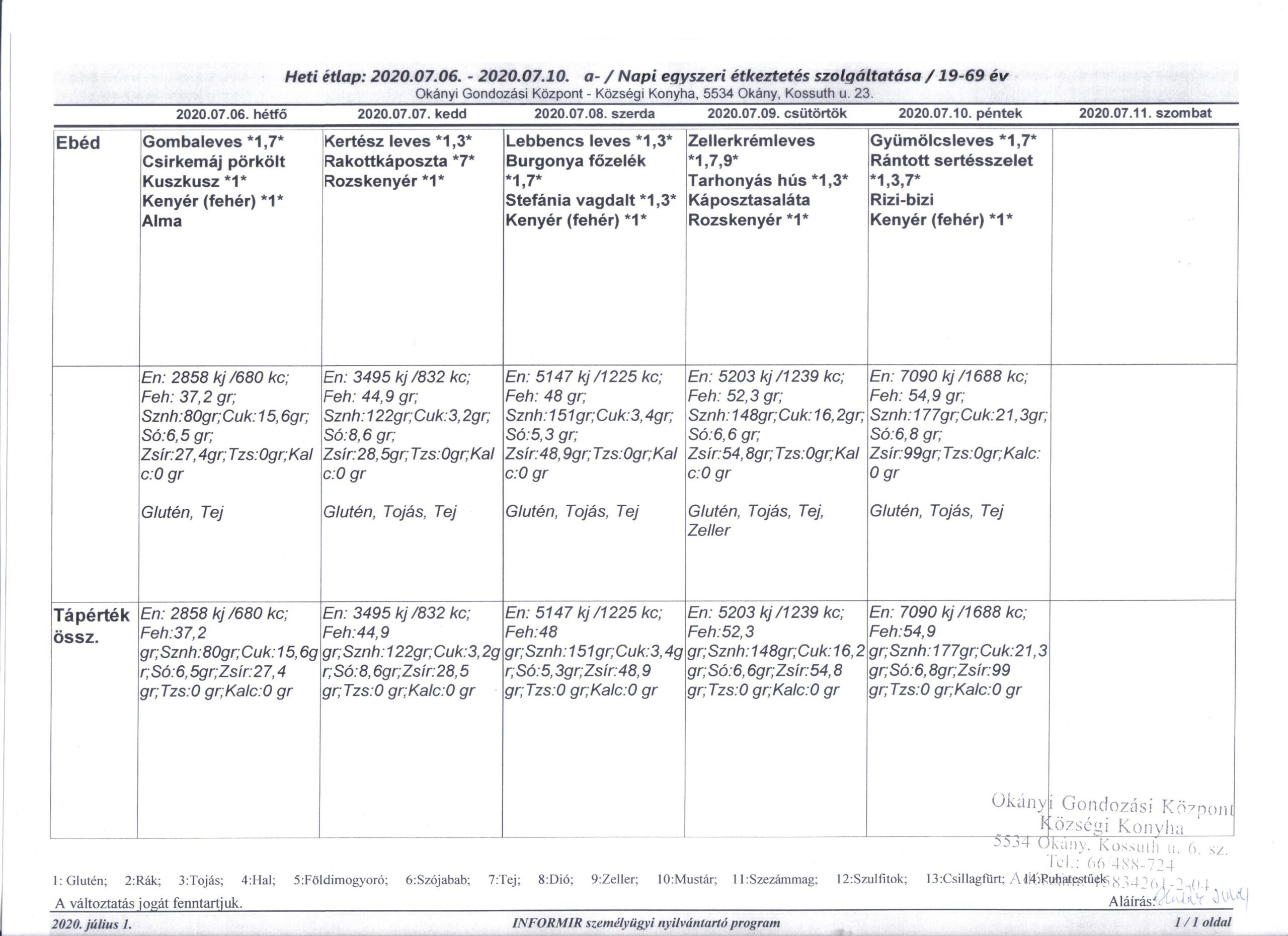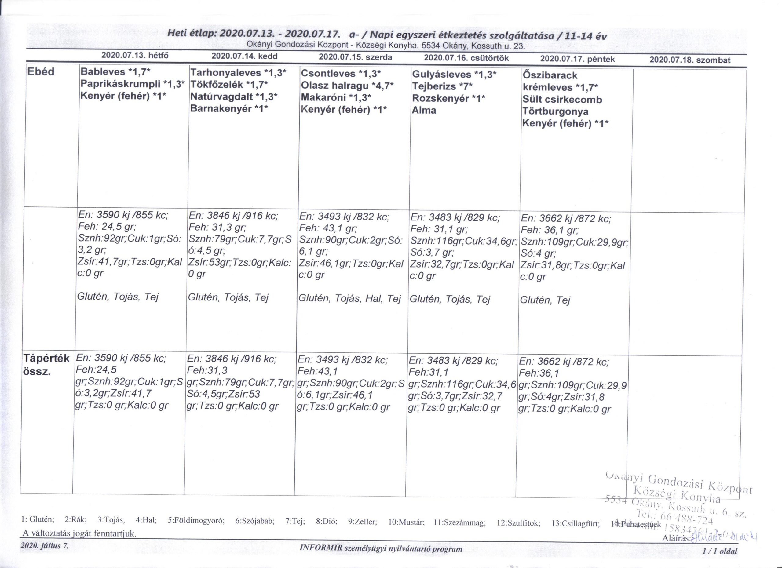 Konyha Étlap korosztályos bontásban 2020.07.13. – 2020.07.17.