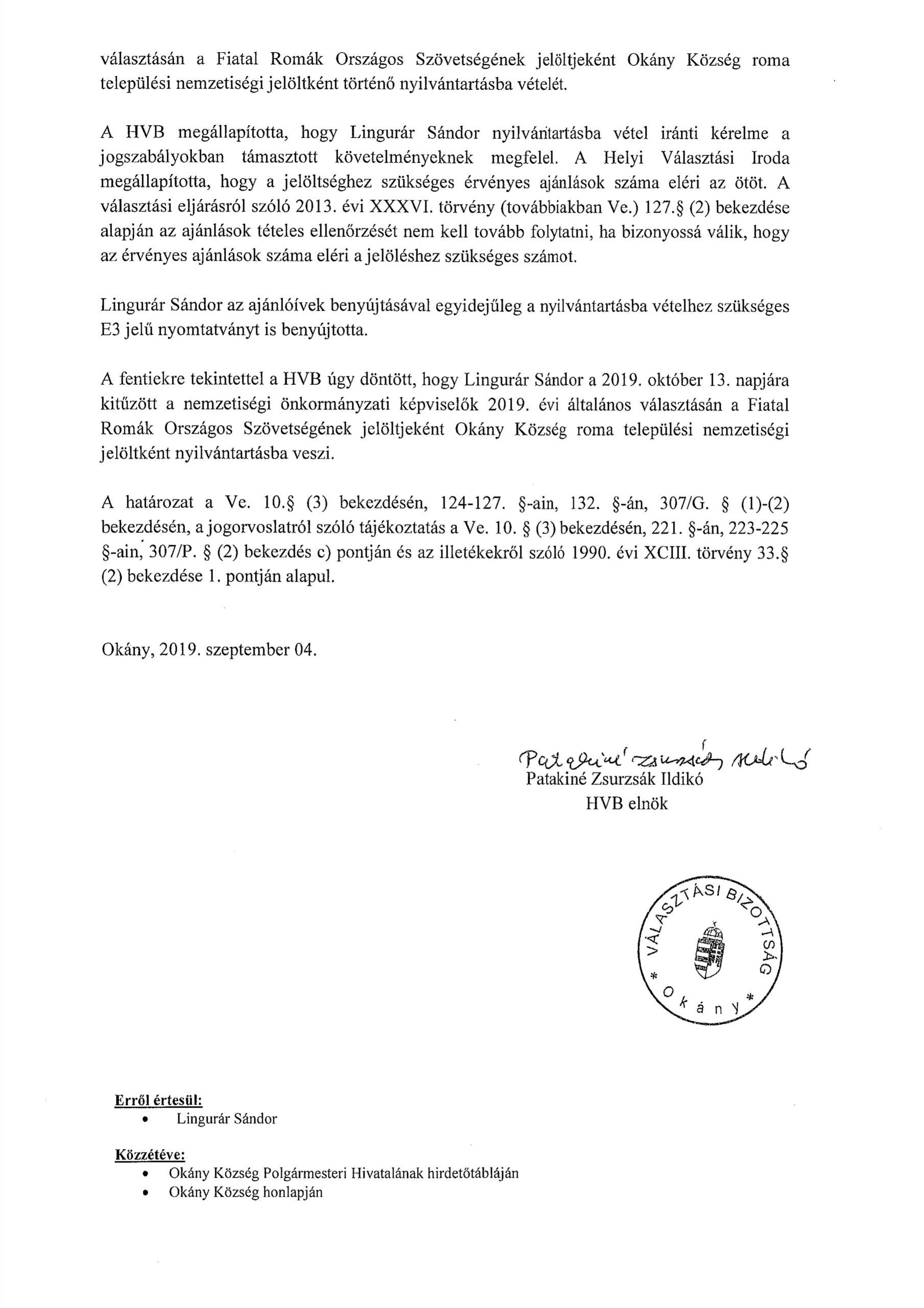Lingurár Sándor nyilvántartásba vétele