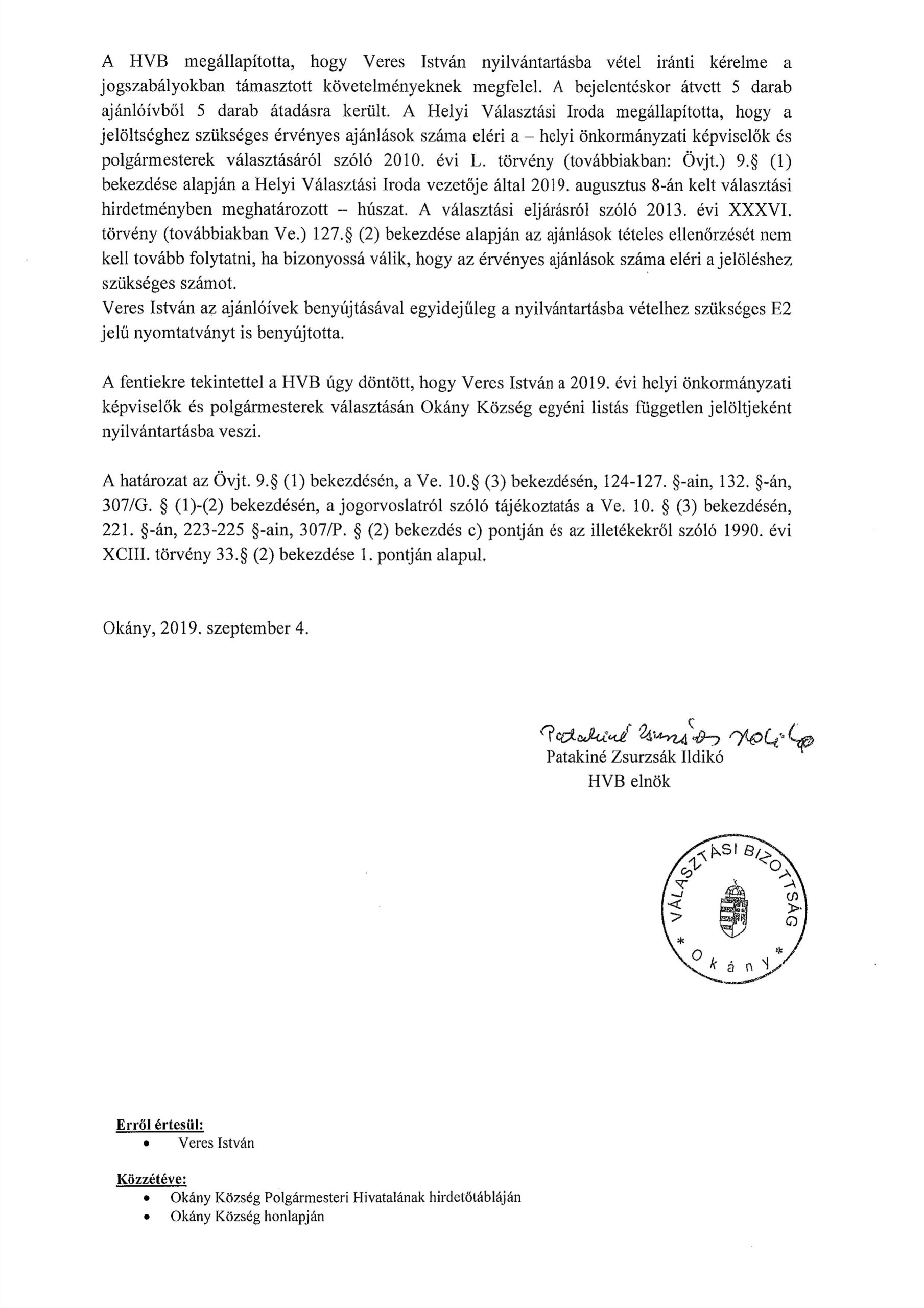 Veres István nyilvántartásba vétele