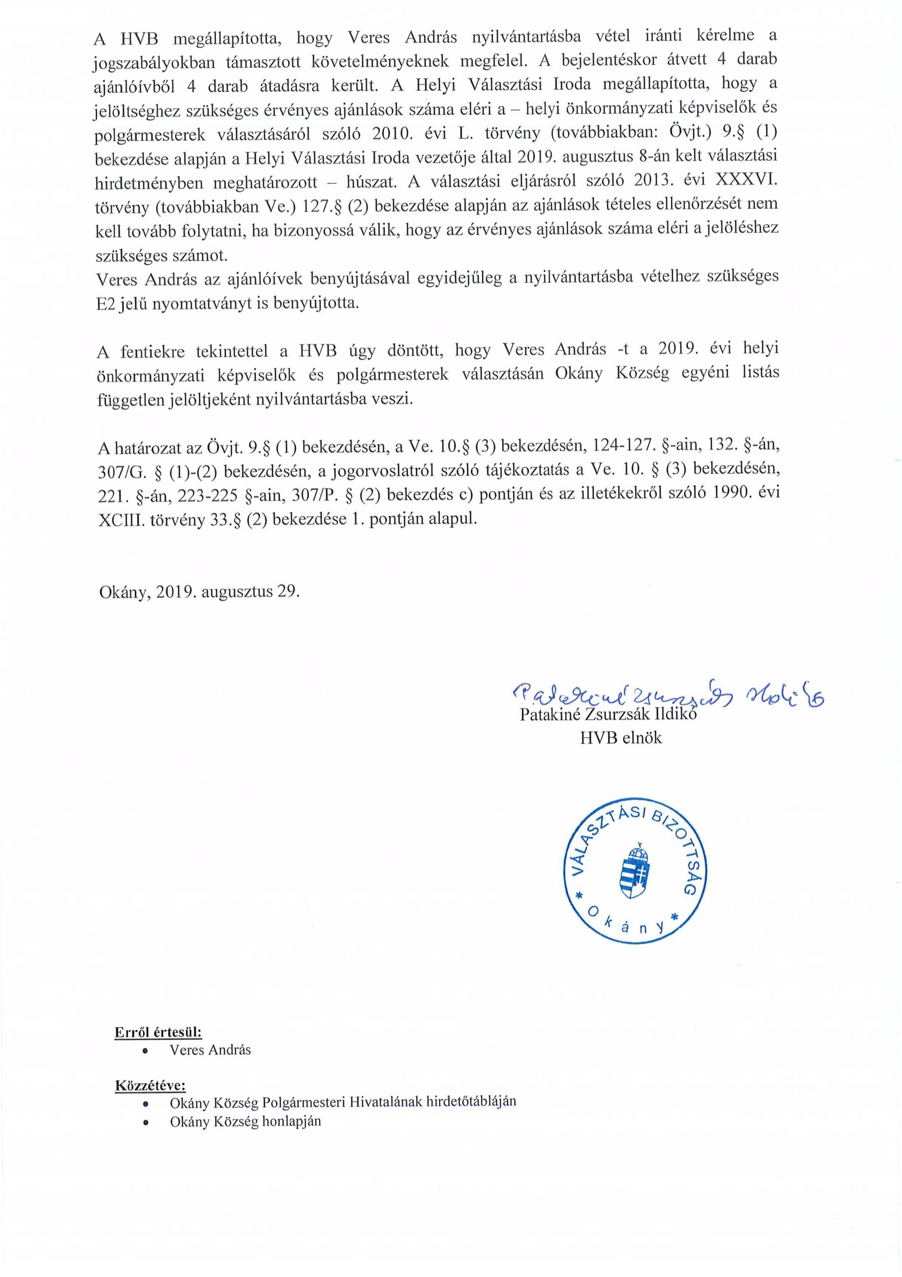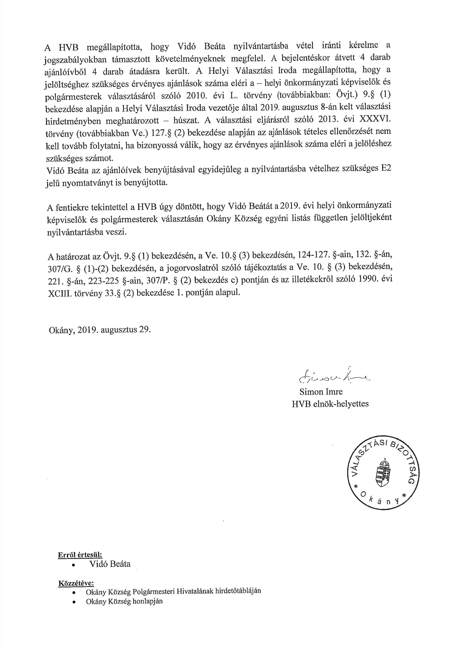Vidó Beáta nyilvántartásba vétele