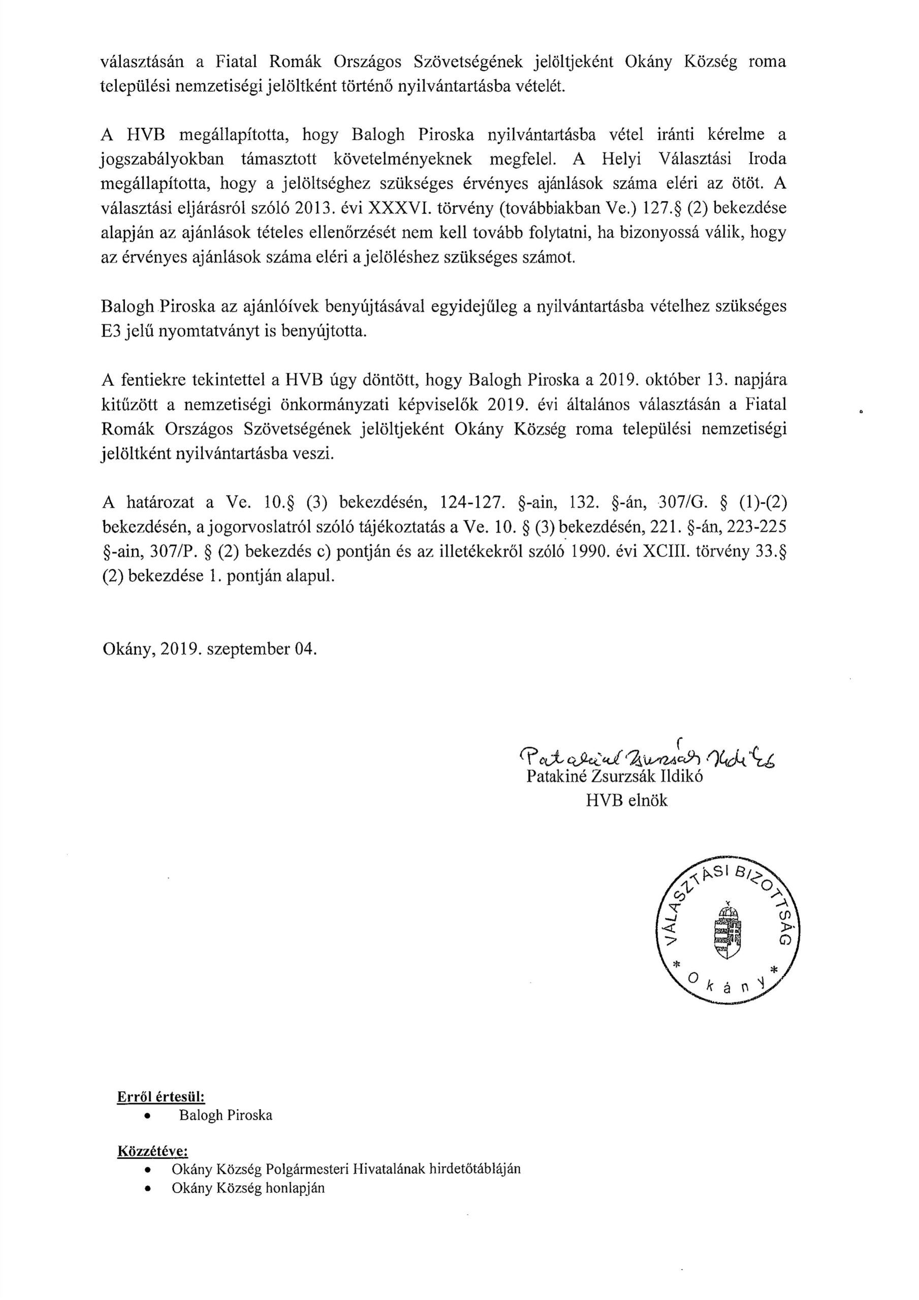Balogh Piroska nyilvántartásba vétele