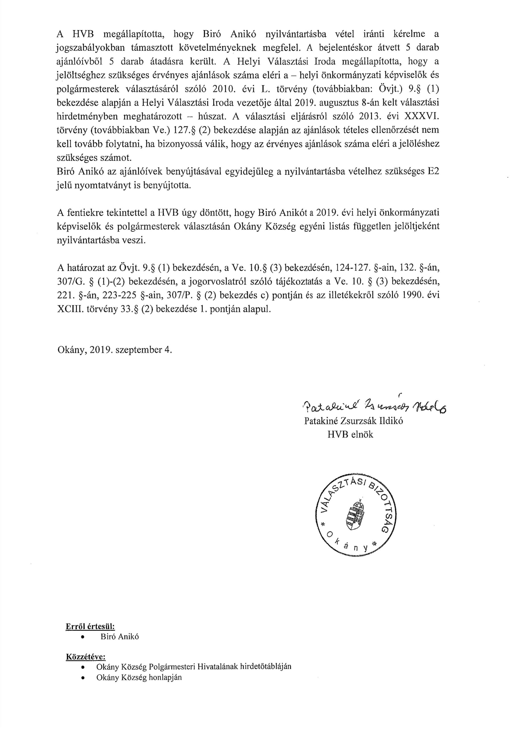 Bíró Anikó nyilvántartásba vétele