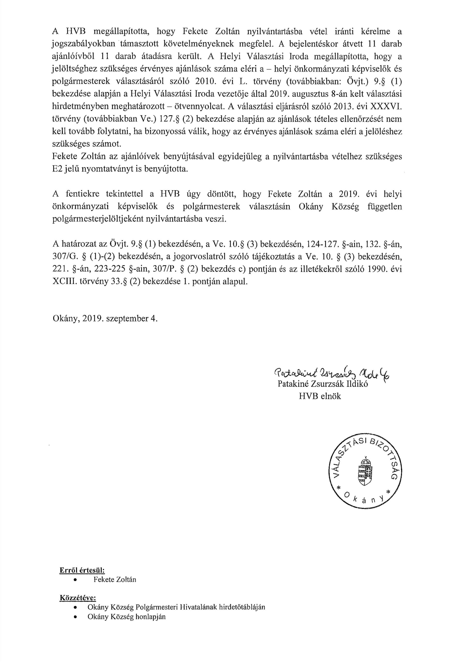 Fekete Zoltán nyilvántartásba vétele