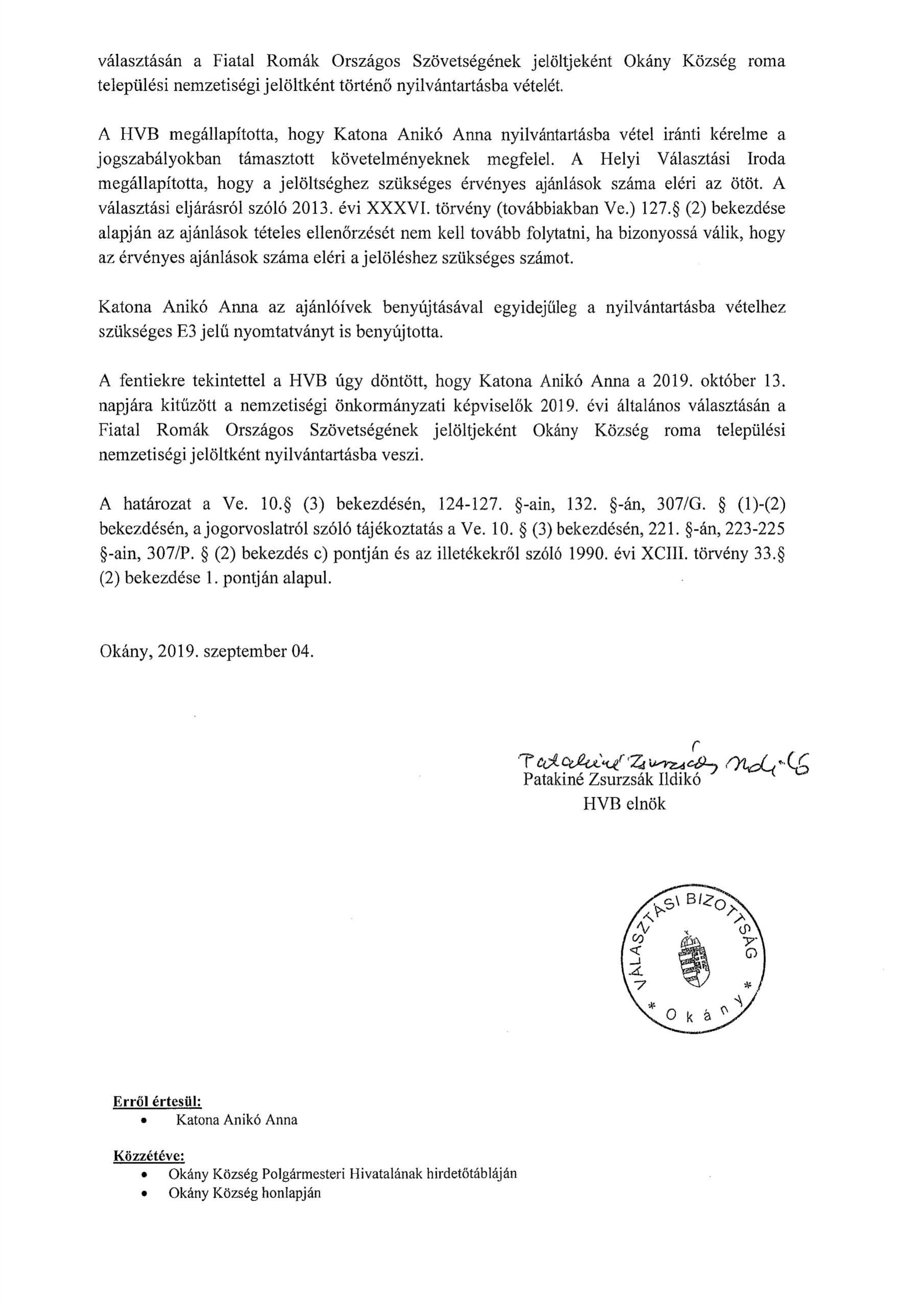 Katona Anikó Anna nyilvántartásba vétele