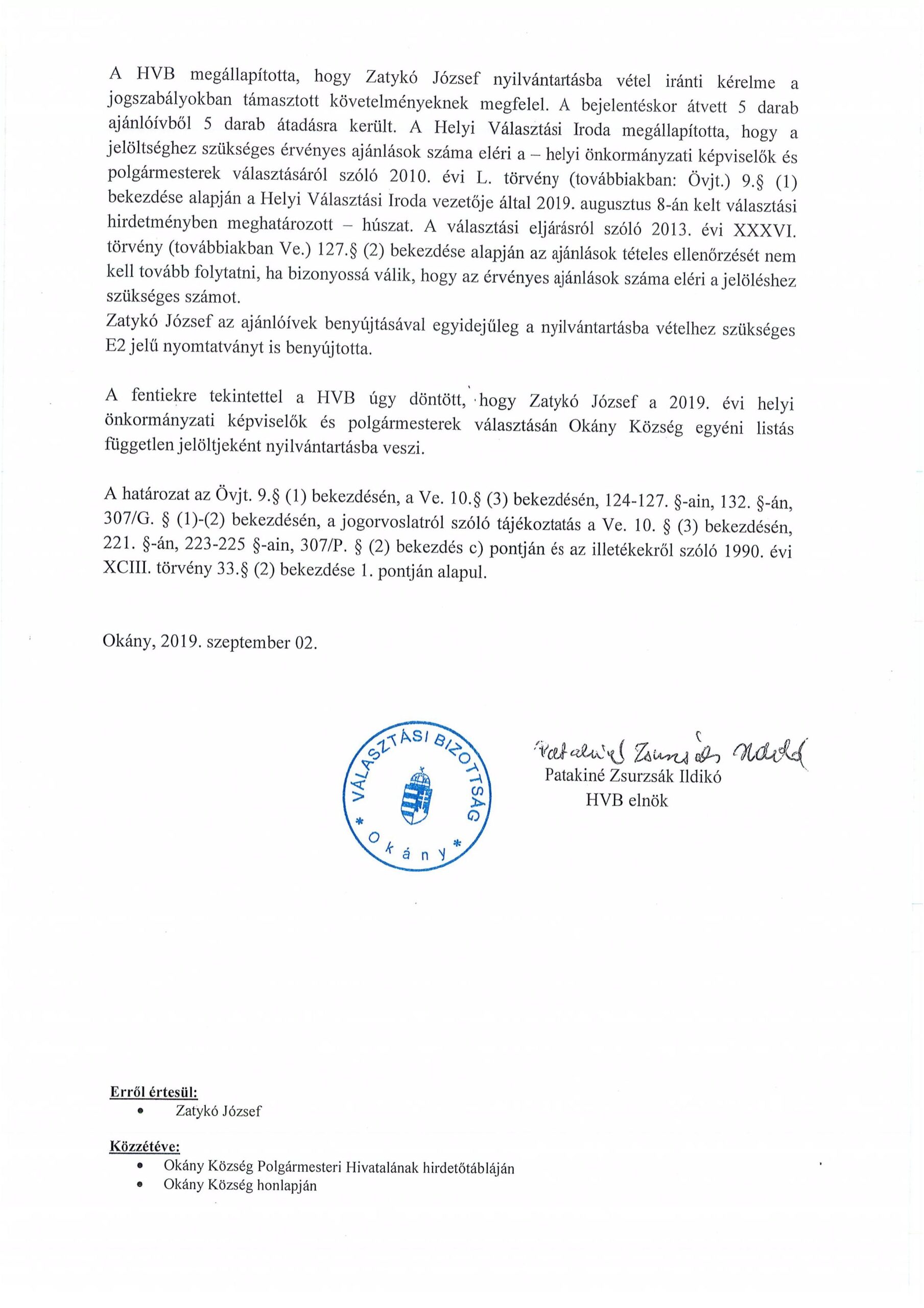 Zatykó József nyilvántartásba vétele