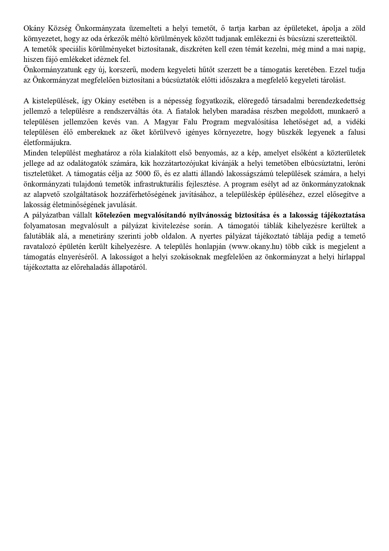 Tájékoztatom a Község lakosságát, hogy Okány Község Önkormányzata sikeresen pályázott a Magyar falu program keretén belül, a községi temető fejlesztésére.